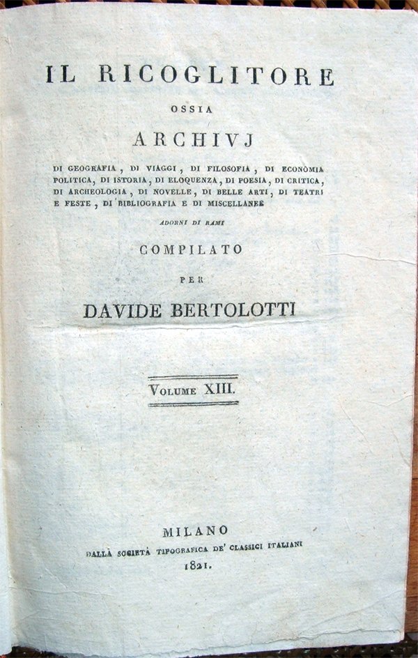 Il Ricoglitore ossia archivj di geografia, di viaggi, di filosofia . di istoria . di poesia . di archeologia, di novelle, di belle arti, di teatri e feste, di bibliografia . adorni di rami, compilato per Davide Bertolotti. Volumi XIII e XIV