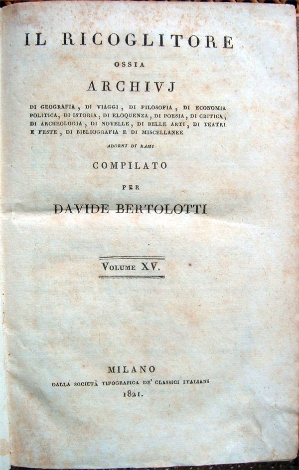 Il Ricoglitore ossia archivj di geografia, di viaggi, di filosofia . di istoria . di poesia . di archeologia, di novelle, di belle arti, di teatri e feste, di bibliografia . adorni di rami, compilato per Davide Bertolotti. Volumi XV e XVI