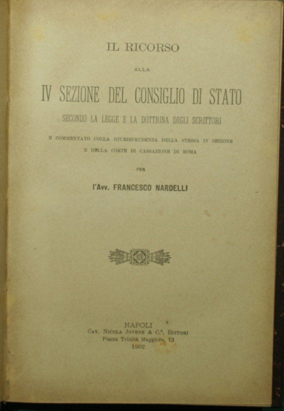 Secondo la legge e la dottrina degli scrittori - E commentato colla giurisprudenza della stessa IV sezione e della Corte di Cassazione di Roma - in 8° - pp.442 - Tela con titolo e fregi in oro al dorso - Lievi abrasioni al dorso