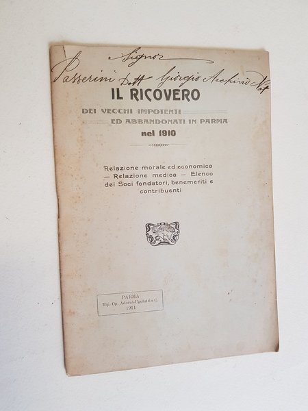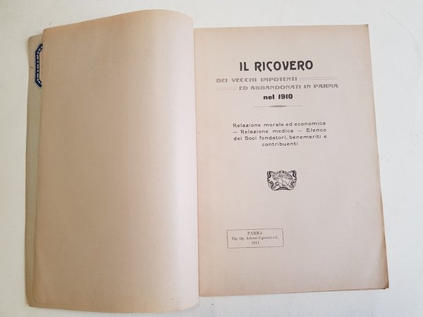 Il Ricovero dei Vecchi impotenti ed abbandonati in Parma nel 1910. Relazione morale ed economica - Relazione medica - Elenco dei Soci fondatori, benemeriti e contribuenti.