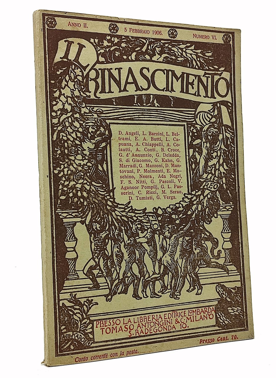 Formato: 16 x 23,5 cm circa. Brossura illustrata da A. De Karolis. Stato di conservazione: marginali ingiallimenti su qualche pagina interna ma, nel complesso, un buon esemplare. Privo di scritte o sottolineature. Nessuna firma o timbro. Sommario del sesto numero del 'Rinascimento': - Massimo Gorki, 'I figli del Sole, dramma'; - Diego Angeli, 'Vecchi ritratti fiorentini, sonetti'; - Roberto Bracco, 'La lotta, novella'; - Silvio Benco, 'Carducci e D'Annunzio'; - C. Giorgieri - Contri, 'Il mendicante - Tra i pioppi, versi'; - Domenico Tumiati, 'La canzone araba della Luna'; - 'Gustave Kahn, 'Dall'accademia al Teatro (Ribot e Barrès . M.lle Dosne - il teatro di F. De Curel)'; Sezione 'Notizie e primizie' (Belle arti, Drammatica, I Libri).