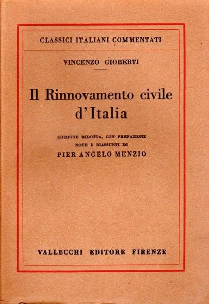 Il Rinnovamento civile d'Italia, edizione 1925, pp. 422, formato 14 x 19,5.<BR>Copertina morbida di colore marrone con titoli in nero al piatto anteriore e sul dorso. Prefazione, note e riassunti di Pier Angelo Menzio. <BR>Condizioni molto buone.