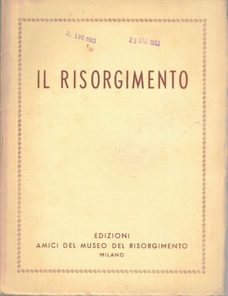 Il Risorgimento, comitato di redazione Enrico Cabella et al., Edizioni Amici del Museo del Risorgimento, Milano, anno XV, numero 2, giugno 1963, pp. 77-133, cm 25, br. ed. Indice: Sergio Camerani, Politica estera e opinione pubblica – Luciano Forlani, La situazione internazionale dell’Italia e le giornate di Adua – Carlo Arrigoni, Una culla diventata nota di serenità accanto alle tenebrose vicende dei Ruffini – Lajos Lucàs, Un garibaldino ungherese dimenticato: Stefano Duniov colonnello italiano – Segnalazione di alcuni libri, a cura di O. Barié et al. – Libri ricevuti. Due piccoli timbri con data alla prima di copertina. Leggera abrasione alla prima di copertina, qualche sporadica sottolineatura a pastello, minime fioriture, lieve brunitura della carta, per il resto ottimo. In parte intonso.