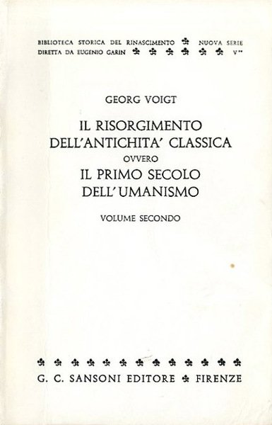 Edizione anastatica. 2 v. (XII, 594; 502 p.) ; 24 x 15 cm. Biblioteca di storia del Rinascimento. Nuova serie. Titolo originale dell'opera: «Die Wiederbelebung des classischen Alterthums, oder Das erste Jahrhundert des Humanismus». Traduzione italiana con prefazione e note del professore D. Valbusa arricchita di aggiunte e correzioni inedite dell'autore. Edizione anastatica a cura di Eugenio Garin. Ripr. facs. dell'ed.: Firenze : Sansoni, 1888-1897. Brossura editoriale, coperta in cartoncino flessibile di colore bianco. All'interno sono riprodotte le cop. dell'edizione originale. Primo volume intonso, alcune sottolineature a matita nelle prime pagine del secondo volume, per il resto i volumi sono in buone condizioni. Codice libreria 3328.