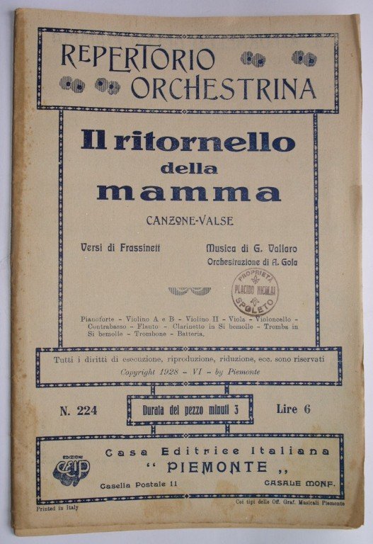In 8. cm 27x18. Pp. 15. Partitura completa per orchestra del 1928. Caratteristica copertina decorata dell'epoca. Ex libris sulla copertina e in qualche pagina. Ottime condizioni a parte una leggera macchia nella copertina. A complete score for orchestra of 1928 of an italian song. Carachteristic decorated cover of that period. Ex libris in the cover. Very good conditions apart for a little stain in the cover.