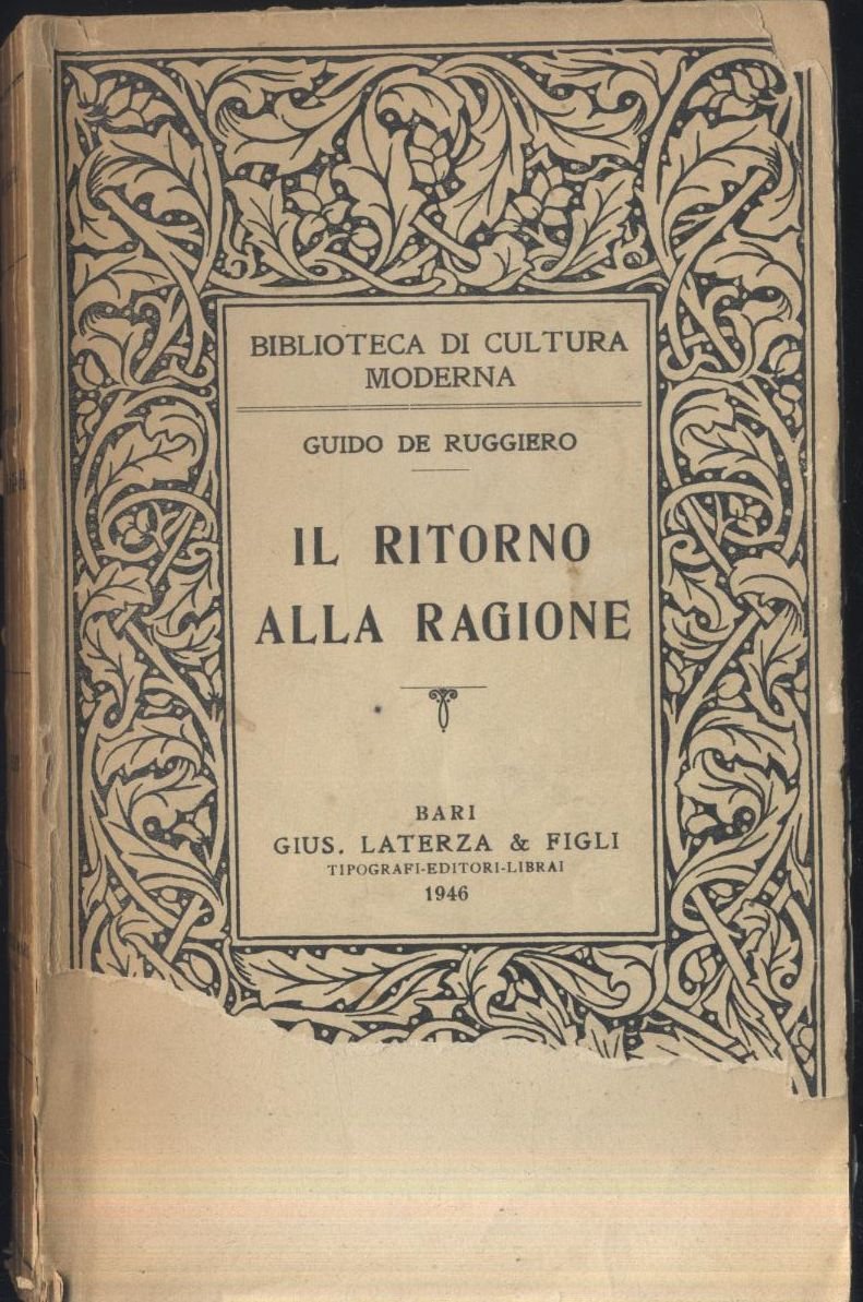 img{max-width:100%}IL RITORNO ALLA RAGIONE di Guido De Ruggiero Laterza editore,1946 VIII, 298 pagine. copertina editoriale in brossura. Stato di conservazione: buono (pagine ingiallite, sottolineature a matita, copertina sciupata con vistosa mancanza al piatto anteriore)