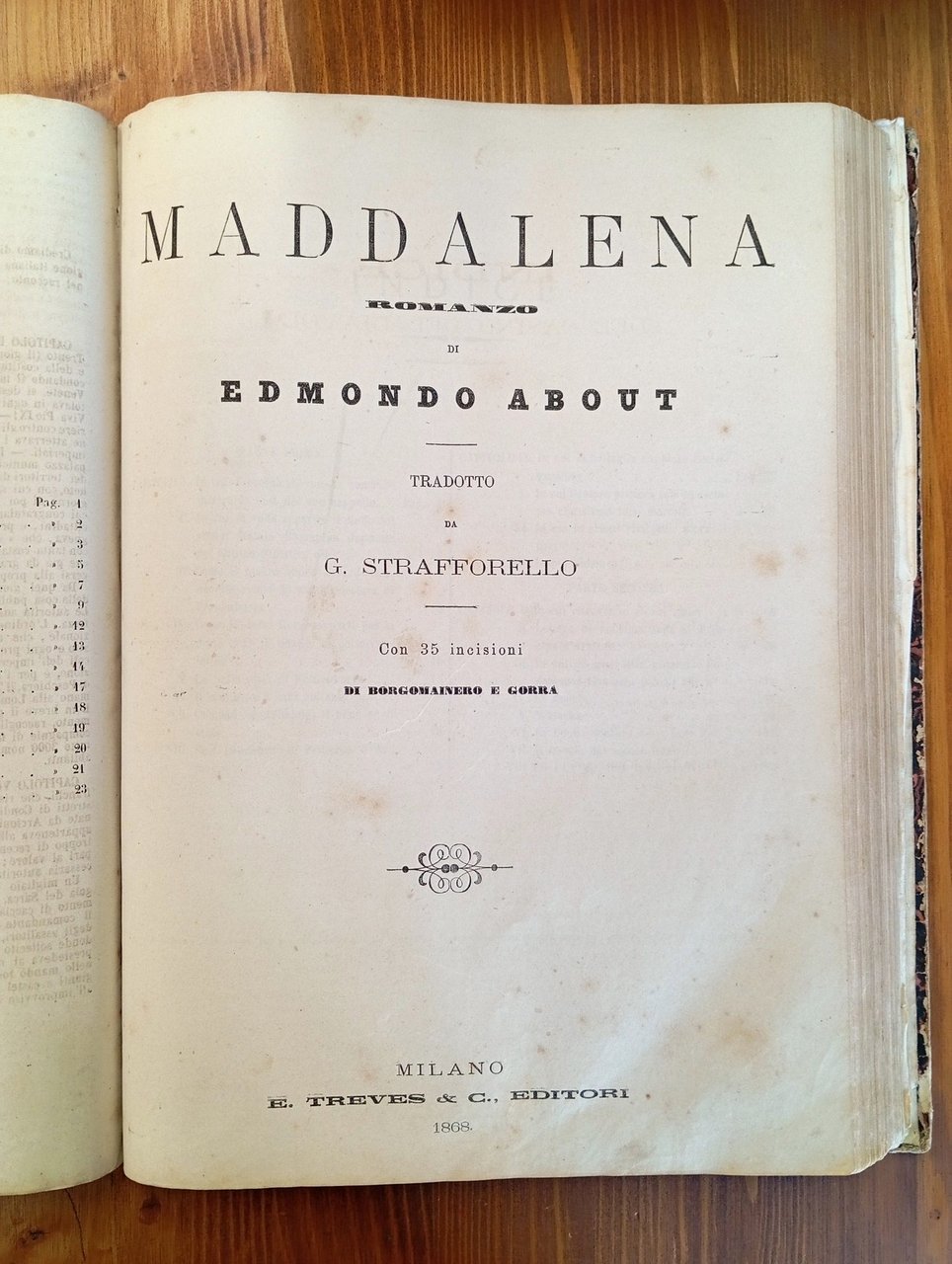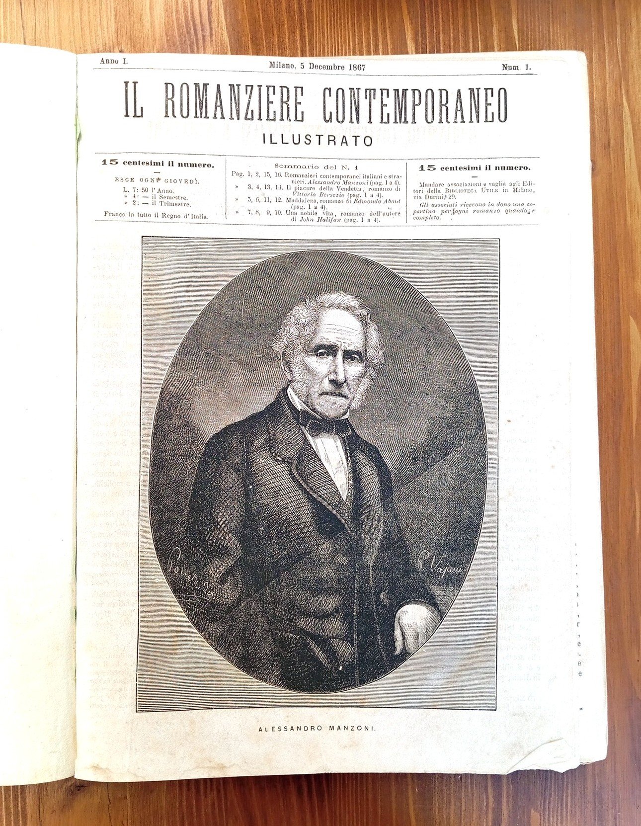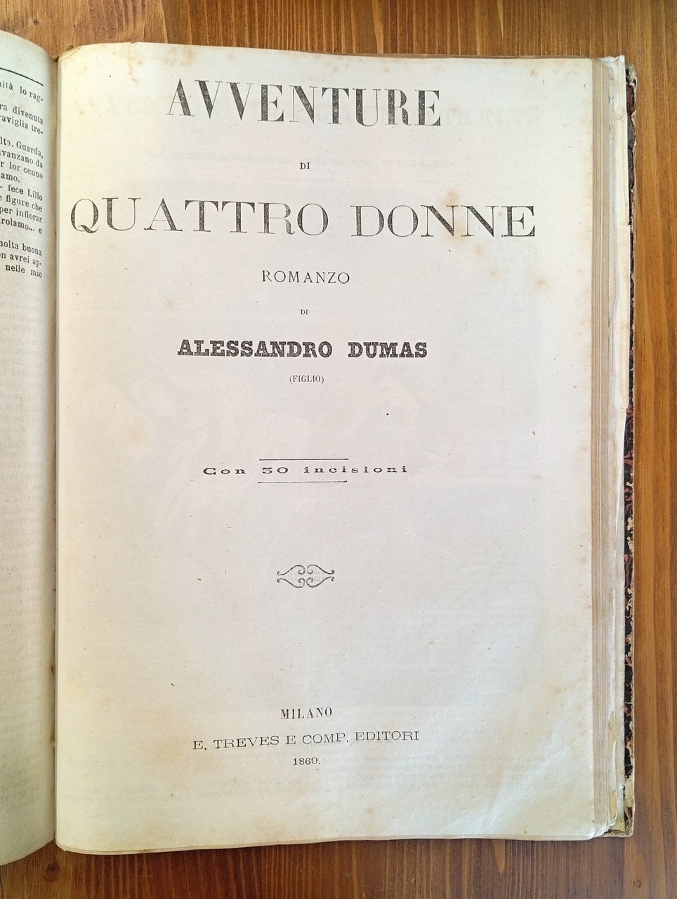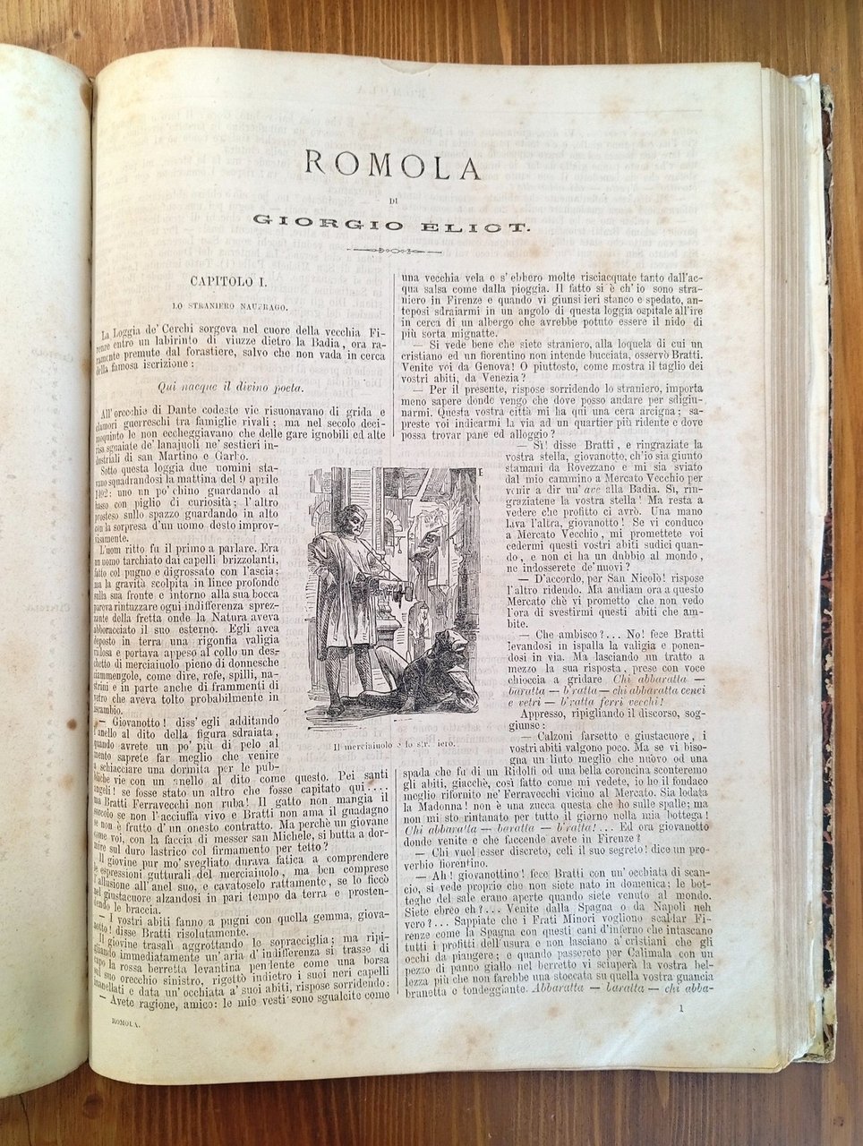 Volume rilegato in mezza pelle, titolo in oro al dorso, piatti marmorizzati. Raccoglie le seguenti opere: 1) IL ROMANZIERE CONTEMPORANEO ILLUSTRATO, Anno I, dal n. 1 del 5 decembre [sic] 1867 al n. 52 del 26 novembre 1868 - ovvero l'annata completa; ciascun fascicolo reca un ritratto di romanziere inciso alla prima pagina e conta 4 facciate, per un totale di 208 pagine a numerazione continua - 2) John HALIFAX, "Una nobile vita" (senza data ma fine '800, Tip. Chiusi e Rechiedei, 60 pagine) - 3) Vittorio BERSEZIO, "Il piacere della vendetta" (senza data ma fine '800, Tip. Chiusi e Rechiedei, 60 pagine) - 4) Bartolomeo MALFATTI, "Il casino del diavolo. Novella" (senza data ma fine '800, Tip. Internazionale, 28 pagine) - 5) Edmondo ABOUT, "Maddalena. Romanzo" (Treves, Milano, 1868, 128 pagine con 35 incisioni di Borgomainero e Gorra) - 6) Giorgio ELIOT, "Romola. Romanzo storico" (Treves, Milano, 1868, 120 pagine con 23 incisioni) - 7) Alessandro DUMAS, "Avventure di quattro donne. Romanzo" (Treves, Milano, 1869, 142 pagine con 30 incisioni) - 8) Carlo DICKENS, "L'abisso" (senza frontespizio e dunque senza indicazione di editore e data di stampa ma Treves, Milano, 1868, 28 pagine con una incisione a tutta pagina) - La raccolta risulta purtroppo malamente conservata, il tempo ha poi lasciato i suoi segni sulla carta leggera tipica di quell'epoca; piegature, occasionali strappi e distaccamenti non inficiano comunque sulla completezza dei fascicoli qui riuniti, in certi casi molto rari e nella loro prima traduzione italiana. Il volume è perciò da considerarsi, nonostante tutto, di notevole importanza documentale - Nella seconda metà dell'Ottocento, in Italia, l'aumento sensibile della media delle copie vendute di ogni singolo titolo motiva gli imprenditori a sostenere l'espansione del mercato, puntando sull'alleanza fra editoria periodica e libraria. Il romanzo imperversa sulle principali testate e nascono riviste a esso riservate, come "Il romanziere illustrato" di Sonzogno (1865), al quale Treves risponde con "Il romanziere contemporaneo illustrato" (1867). Le due case milanesi, in serrata competizione su molti fronti, idearono collane fondamentali nel determinare l'egemonia del romanzo francese in ambito italiano, durata sino al primo Novecento.