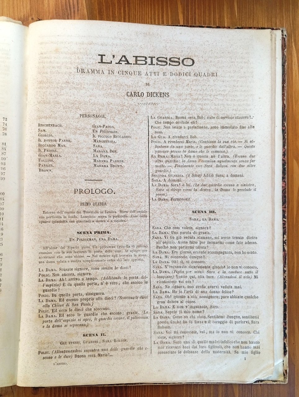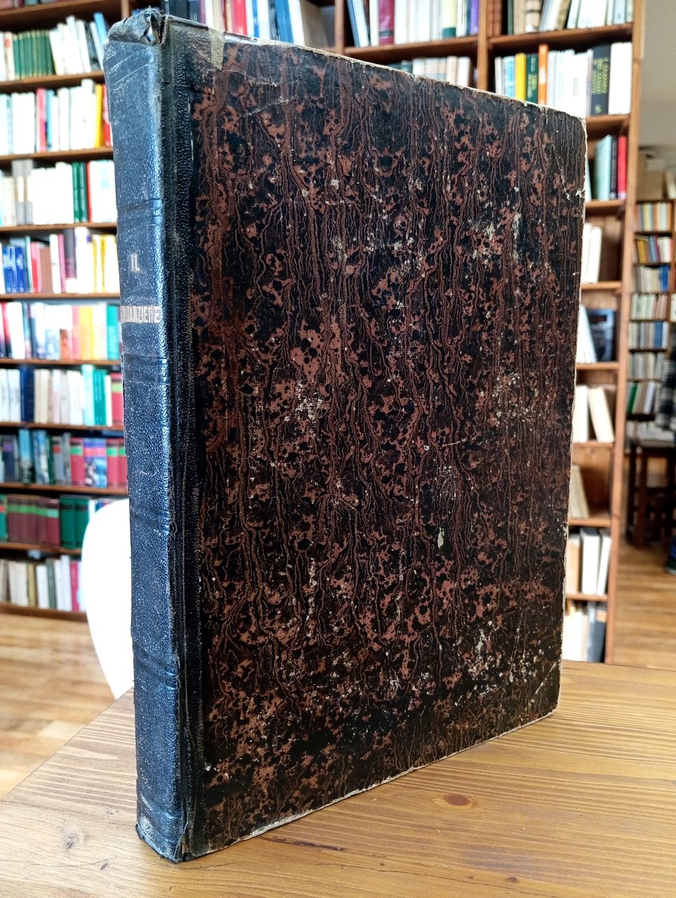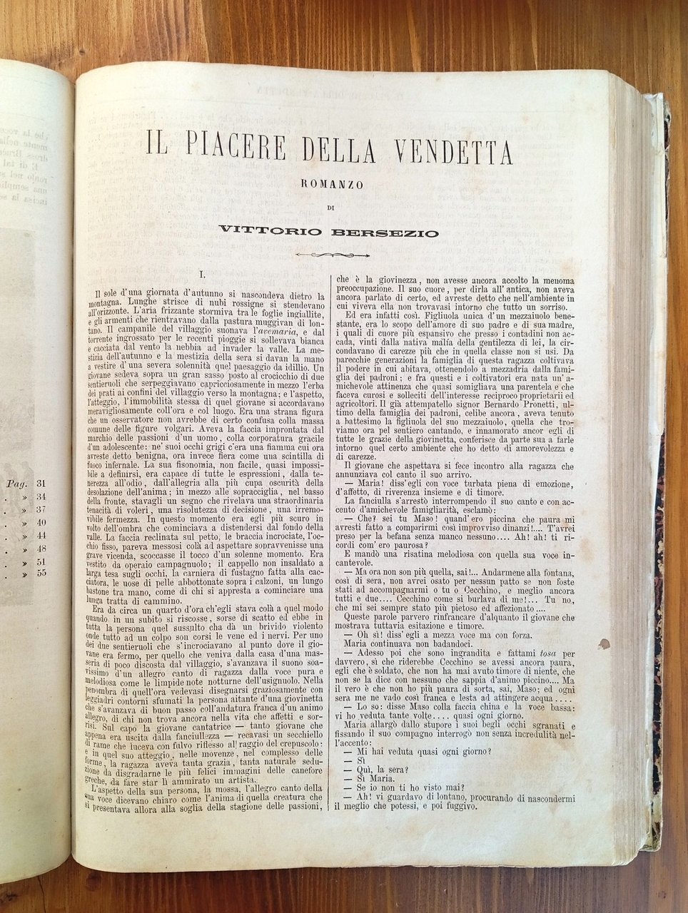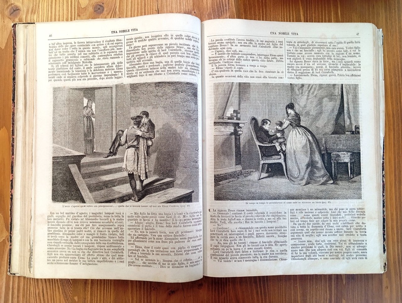 Volume rilegato in mezza pelle, titolo in oro al dorso, piatti marmorizzati. Raccoglie le seguenti opere: 1) IL ROMANZIERE CONTEMPORANEO ILLUSTRATO, Anno I, dal n. 1 del 5 decembre [sic] 1867 al n. 52 del 26 novembre 1868 - ovvero l'annata completa; ciascun fascicolo reca un ritratto di romanziere inciso alla prima pagina e conta 4 facciate, per un totale di 208 pagine a numerazione continua - 2) John HALIFAX, "Una nobile vita" (senza data ma fine '800, Tip. Chiusi e Rechiedei, 60 pagine) - 3) Vittorio BERSEZIO, "Il piacere della vendetta" (senza data ma fine '800, Tip. Chiusi e Rechiedei, 60 pagine) - 4) Bartolomeo MALFATTI, "Il casino del diavolo. Novella" (senza data ma fine '800, Tip. Internazionale, 28 pagine) - 5) Edmondo ABOUT, "Maddalena. Romanzo" (Treves, Milano, 1868, 128 pagine con 35 incisioni di Borgomainero e Gorra) - 6) Giorgio ELIOT, "Romola. Romanzo storico" (Treves, Milano, 1868, 120 pagine con 23 incisioni) - 7) Alessandro DUMAS, "Avventure di quattro donne. Romanzo" (Treves, Milano, 1869, 142 pagine con 30 incisioni) - 8) Carlo DICKENS, "L'abisso" (senza frontespizio e dunque senza indicazione di editore e data di stampa ma Treves, Milano, 1868, 28 pagine con una incisione a tutta pagina) - La raccolta risulta purtroppo malamente conservata, il tempo ha poi lasciato i suoi segni sulla carta leggera tipica di quell'epoca; piegature, occasionali strappi e distaccamenti non inficiano comunque sulla completezza dei fascicoli qui riuniti, in certi casi molto rari e nella loro prima traduzione italiana. Il volume è perciò da considerarsi, nonostante tutto, di notevole importanza documentale - Nella seconda metà dell'Ottocento, in Italia, l'aumento sensibile della media delle copie vendute di ogni singolo titolo motiva gli imprenditori a sostenere l'espansione del mercato, puntando sull'alleanza fra editoria periodica e libraria. Il romanzo imperversa sulle principali testate e nascono riviste a esso riservate, come "Il romanziere illustrato" di Sonzogno (1865), al quale Treves risponde con "Il romanziere contemporaneo illustrato" (1867). Le due case milanesi, in serrata competizione su molti fronti, idearono collane fondamentali nel determinare l'egemonia del romanzo francese in ambito italiano, durata sino al primo Novecento.