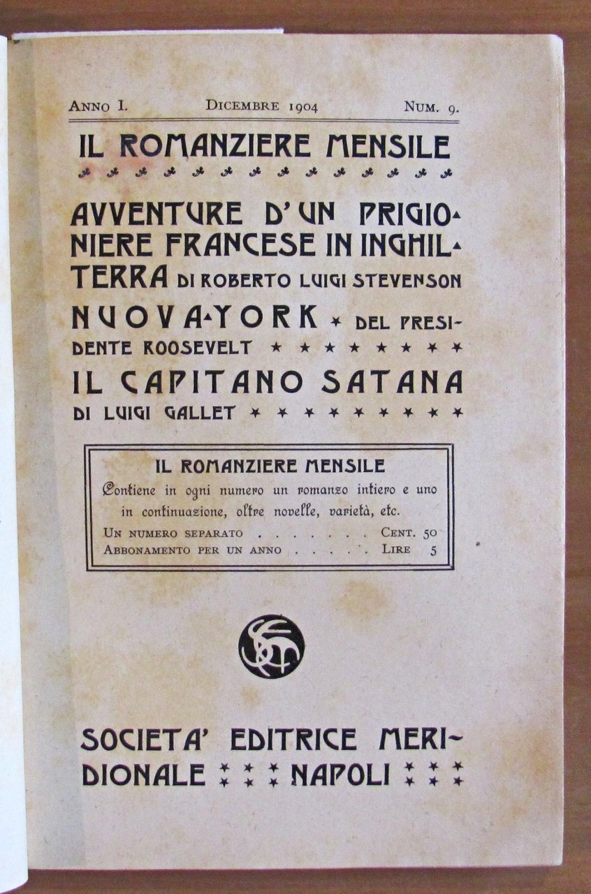 Avventure di un prigioniere francese in Inghilterra di Stevenson; Nuova York del Presidente Roosevelt; Il Capitano Satana di Gallet. Anno I - Dicembre 1904 - Num.9. Società Editrice Meridionale - Napoli, 1904. Illustrazioni in b/n n.t. e tavole monocromatiche f.t. di Pisani. Brossura editoriale con lievi bruniture del tempo in qualche pagina. 14x21; pp.127. Ottimo stato. , Ottimo (Fine)