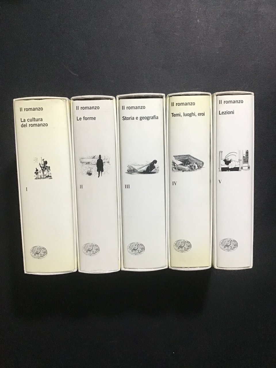 Vol. I: La cultura del romanzo; Vol. II: Le forme; Vol. III: Storia e geografia; Vol. IV: Temi, luoghi, eroi; Vol. V: Lezioni. Tavole a colori e in bianco e nero. Ingialliture ai bordi dei cofanetti e di alcune sovracoperte
