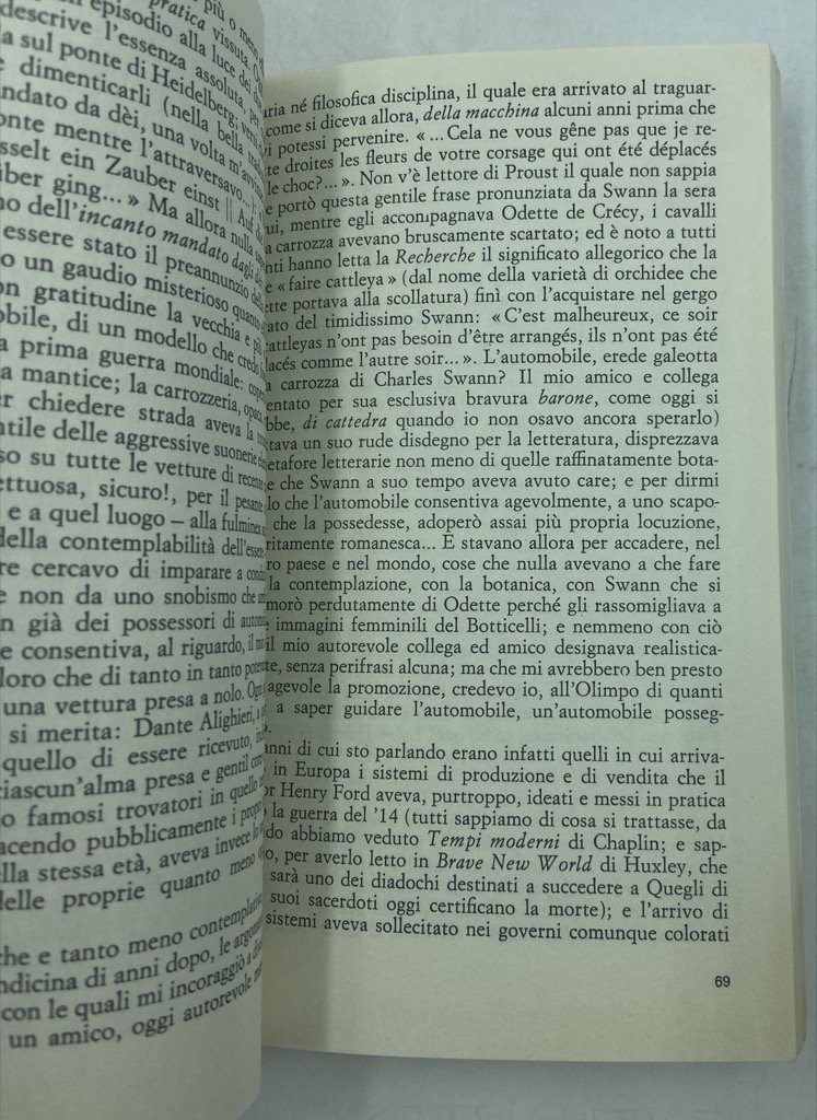 Brossura editoriale illustrata, cm 18 x 11, pp VI 176 (10). Collana TV Tascabili Vallecchi, numero 41. Lievi arrossamenti sulla brossura. Edizione originale. Antologia dedicata al fenomeno della motorizzazione, «limitato nella definizione ma pressoché illimitato nelle conseguenze», curata da Rodolfo Quadrelli, intellettuale milanese con posizioni vicine al pensiero della tradizione e del rifiuto del «regno della quantità» che gli valsero la nomina tra gli «ultras della sottocultura» da parte di Umberto Eco sulle pagine de l'Espresso (1972). Profetica condanna della civiltà dell'auto, il volume è efficacemente presentato dal fotomontaggio eidetico di Mimmo Castellano in copertina. Prefazione di Quadrelli, contributi di Quirino Principe (I veicoli a motore: mezzo efficace e radicale di distruzione della società), Rosario Assunto (Confessioni di un automobilista contemplativo con codicillo logico-metafisico sui compossibili e il principio di non contraddizione), Guido Ceronetti (L'automobile e la carne), Renato Bazzoni (La città si difende dall'automobile), Alfredo Todisco (La piovra autostradale), Marco G. Pellifroni (Gli altri motori).