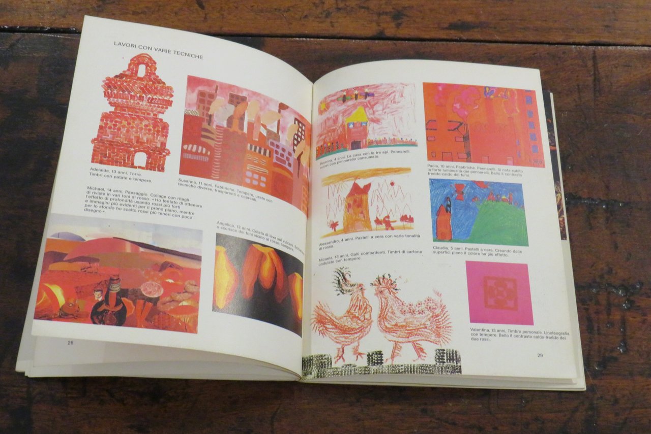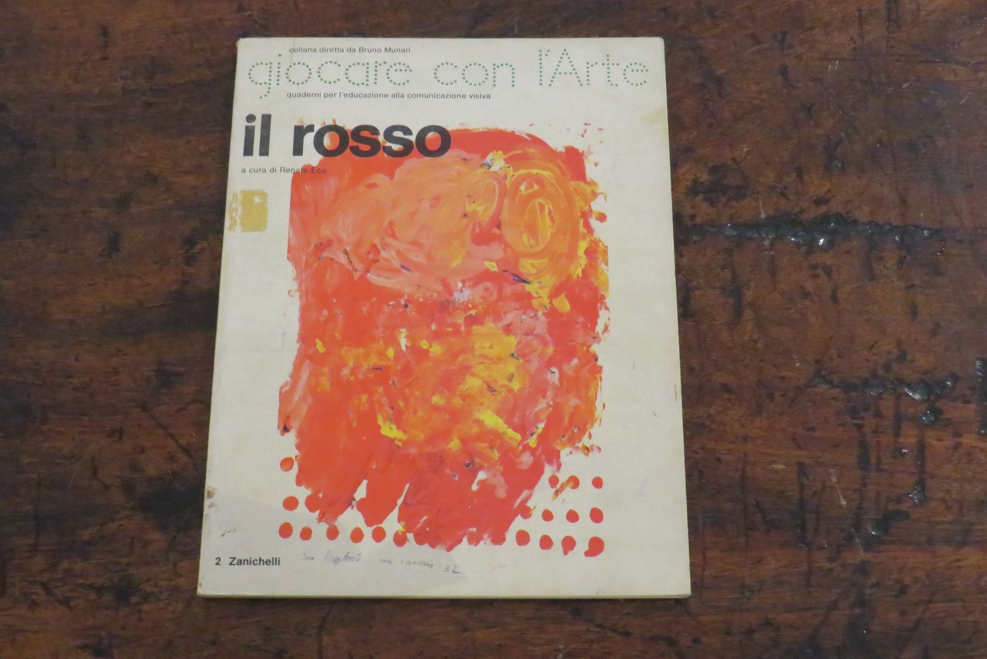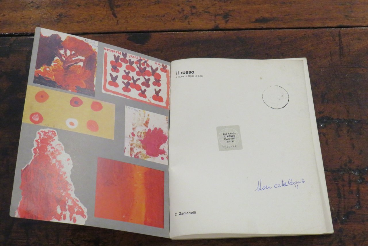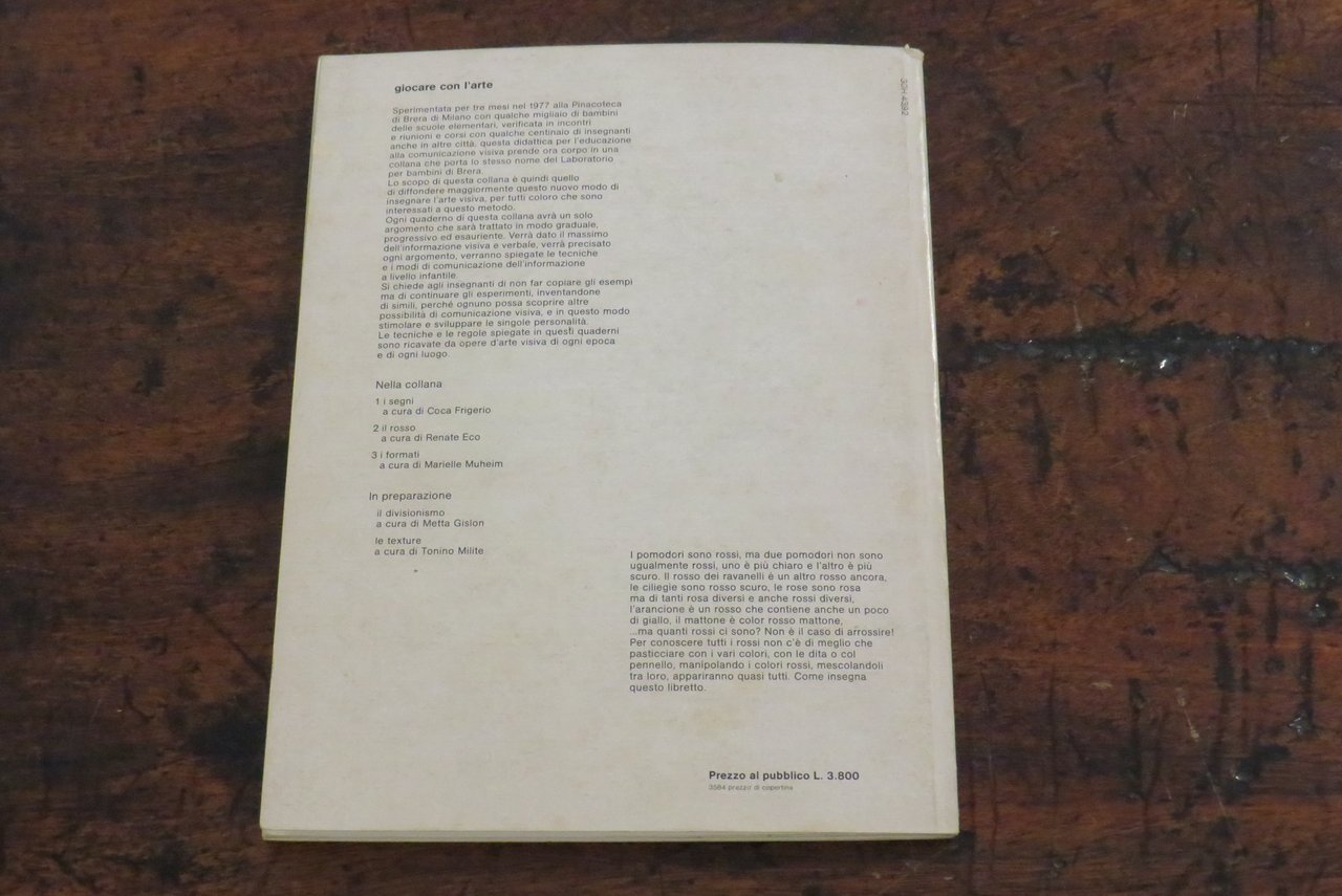Bologna, Zanichelli, 1979. In -8 grande (mm. 190,2x250), pp. 63, con numerose illustrazioni a colori nel testo. Brossura editoriale illustrata a colori al piatto anteriore. A cura di Renate Eco. Collana "Giocare con l’arte", quaderni per l’educazione alla comunicazione visiva, N. 2, diretta da Bruno Munari. Manuale didattico. Libro stampato in Offset. La collana dell’editore Zanichelli nata nel 1979, ideata e diretta da Bruno Munari, a cui appartiene una serie di volumi monografici curati da diversi specialisti per l’insegnamento e l’introduzione alla comunicazione visiva come testualmente riporta Bruno Munari: "(…) Sperimentata per tre mesi nel 1977 alla Pinacoteca di Brera di Milano con qualche migliaio di bambini delle scuole elementari, successivamente verificata in incontri, riunioni e corsi con qualche centinaio di insegnanti anche di altre città, questa didattica per l’educazione alla comunicazione visiva, prende corpo ora in una collana che porta lo stesso nome del Laboratorio per bambini di Brera…". Questo volume è dedicato all’utilizzo e all’impiego creativo del colore rosso nell’attività del disegno e della pittura, con una ampia ricognizione di esempi e modelli didattici e con spunti che rimandano alla tradizione pittorica attraverso i secoli. Prima edizione. Scritta a penna al frontespizio ("Non catalogato"), lievi tracce di usura ai piatti della copertina, ma nel complesso ottimo.