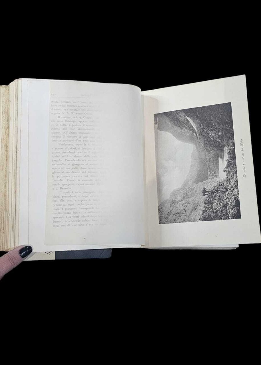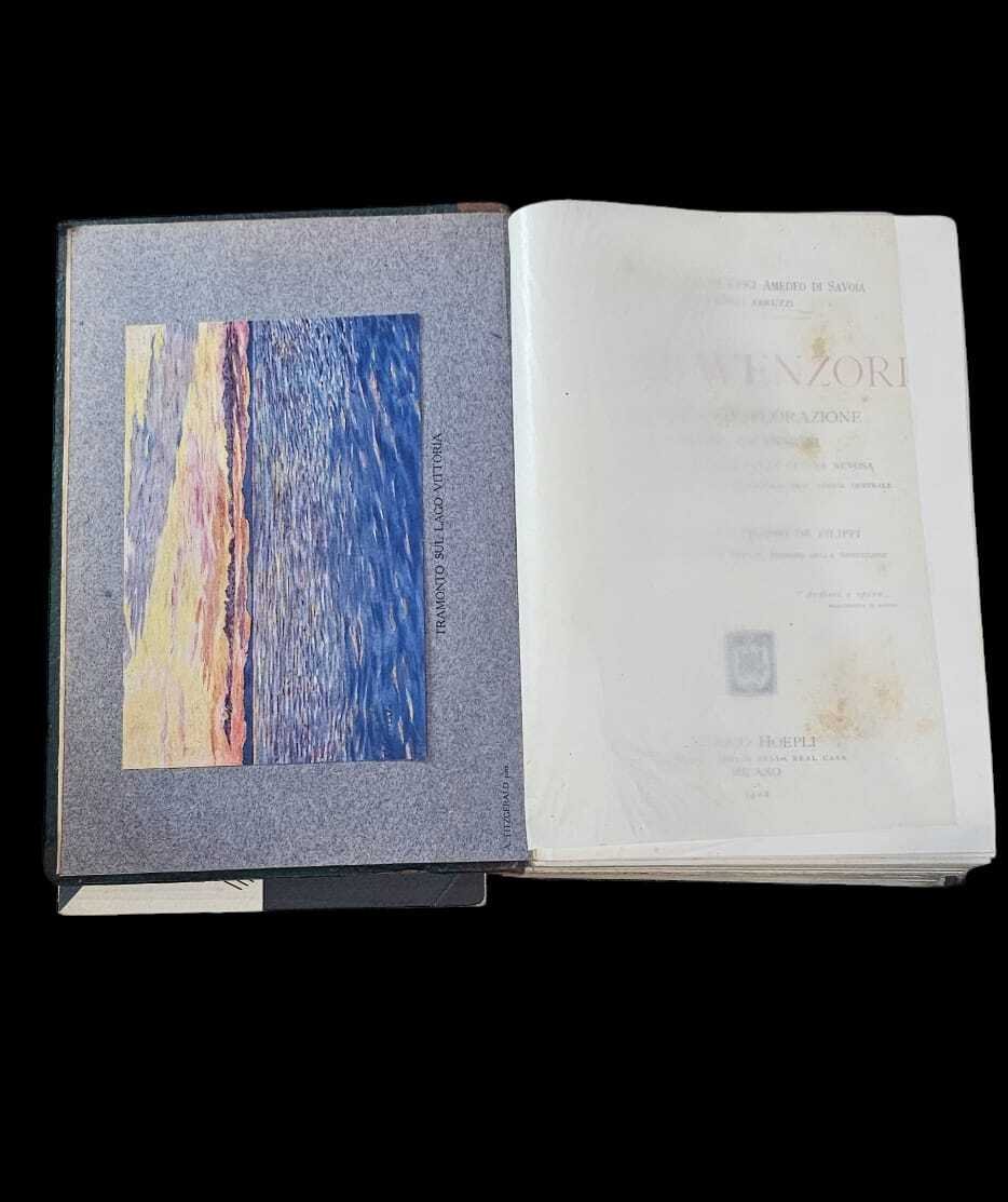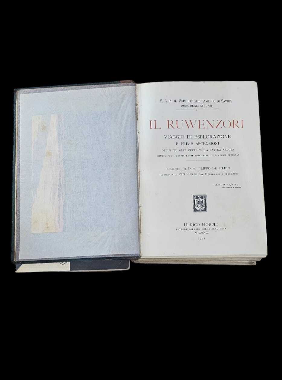 Edizione originale della relazione del viaggio sulla catena del Ruwenzori, in Uganda, alla quale in realta' De Filippi non prese parte pur essendo chiamato alla redazione del testo. La spedizione fu organizzata da Luigi Amedeo di Savoia, il Duca degli Abruzzi, con una carovana al seguito che contava circa 400 persone tra portatori, cuochi e guide alpine fatte arrivare direttamente da Courmayeur. Nel gruppo era presente anche il fotografo Vittorio Sella che documento' il viaggio. Presenti inoltre naturalisti che raccolsero e documentarono varie specie botaniche raccogliendo svariate specie vegetali.