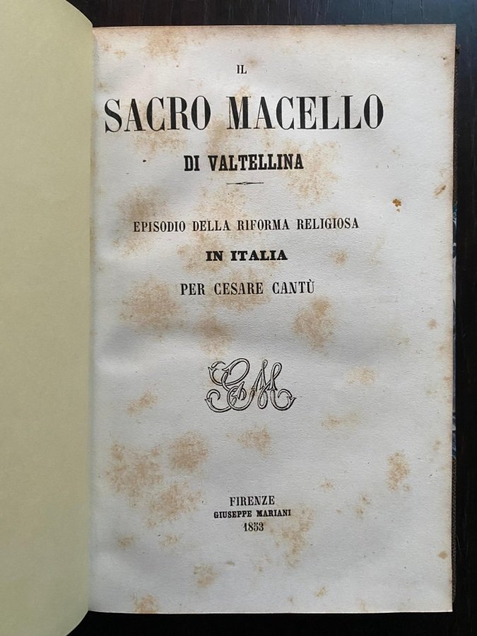 In-16° (cm. 17), legatura successiva in mezza tela bruna ad angoli con piatti marmorizzati; pp. [2] 128 [4] in buono stato (alcune fioriture); marca tipografica al frontespizio. Prima edizione di quest'opera storica dedicata al clamoroso evento valtellinese, e interessante la storia della Riforma e della Controriforma in Italia. Esemplare molto buono.
