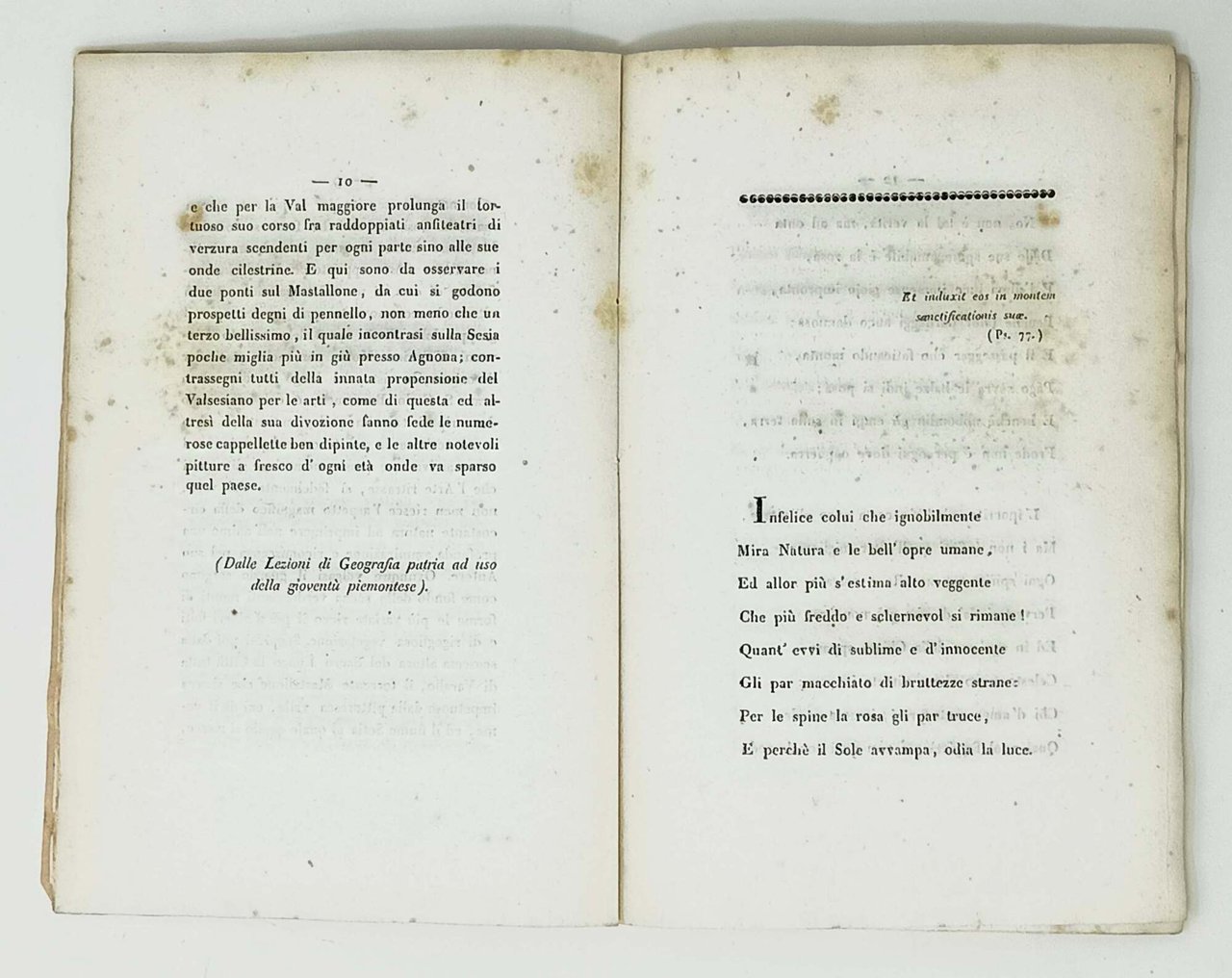 >in-8 (mm223x146), pp. 40, copert. edit. a stampa, carta color seppia con bordura tipografica sui due piatti. I versi del poemetto sono preceduti da ''Cenni intorno al Sacro Monte di Varallo'' su quattro pagine (pp. 7-10). Alle pp. 27 e seguenti, annotazioni ed elenco degli artisti che concorsero ad adornare con opere pittoriche e scultoree il Sacro Monte. Il carrme nacque da una visita di Pellico a Varallo nel 1835 in compagnia del Faletti di Barolo. Edizione originale. ''E' il miglior componimento in poesia che si possiede su questo argomento''. (Durio, Bibliografia del Sacro Monte di Varallo p. 18). Esemplare perfetto, con qualche fioritura, in carta grande, raro. Parenti n.221.