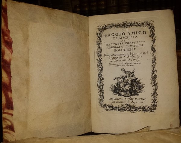 In-8 (18 cm) (2) 131 (1) Marca editoriale incisa al frontespizio: vignetta con figure femminili che leggono con motto "Hominum mores tibi nosse volenti sufficit una Domus". Cartoncino originale decorato con carta a motivi rosso mattone. Bella carta vergata grossa. Lievi abrasioni alla legatura, per il resto esemplare perfetto. La data di stampa presunta, 1769, si ricava dal titolo. Commedia in tre atti preceduta dalla dedica "all'ornatissimo Sig. Alessandro Carli nobile Patrizio Veronese". Carli, Alessandro <1740-1814>: autore delle tragedie "Telaine" e "Longobardi". Albergati Capacelli, Francesco (1728-1804): marchese, senatore, gonfaloniere di Bologna, dedito all'arte drammatica come autore, traduttore ed attore dilettante. Nato e morto a Bologna (1728-1804).