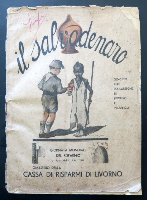 Omaggio della Cassa di Risparmi di Livorno, Giornata Mondiale del Risparmio, 31 ottobre 1935- XIII. In 8vo, pp. 24, bross. orig. in carta illustrata in colore. Pubblicazioni rare a trovarsi. Segni del tempo.