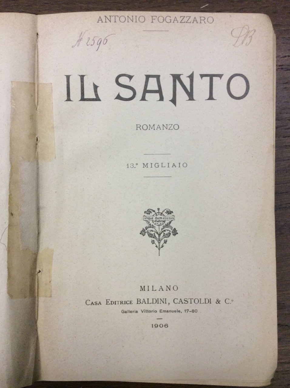 In-16 p., tela coeva (picc. spacco ad una cerniera esterna), pp. (6),477. Prima edizione, 13° migliaio. Leggermente rifilato al margine superiore, tracce di nastro adesivo al frontespizio, ma complessivamente testo in buono stato.