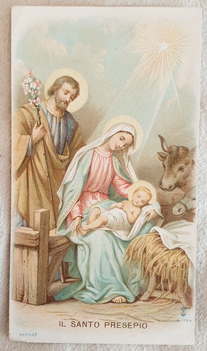 Immaginetta sacra del Santo Presepio. Al verso preghiera. Senza data ma degli anni '60. In ottime condizioni. In 24. Dim. cm 12,5x7. Holy image of Holy Presepio. In the verso prayer. No dated but of 1960's. In very good conditions. In 24. Dim. cm 12,5x7.