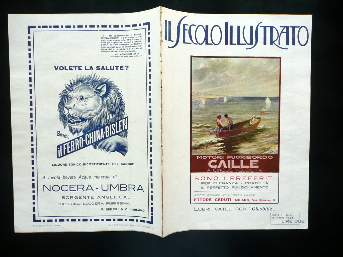 Rivista quindicinale, Il Secolo Illustrato" Rivista quindicinale della grande attualità Anno XI - Numero 8 16 aprile 1923 Società Editoriale Italiana, Milano 1923, cm 33,5x24; da pagina 227 a pagina 254 (esemplare autonomo con numerazione progressiva), con numerose ill. quasi tutte fot. in b/n e virate a vari col. n. t. e f. t., e con varie inserzioni pubblicitarie d'epoca fuori testo; brossura ed. ill. a colori. Numero completo. Condizioni di conservazione Esemplare in buone condizioni con tracce d'uso; margini lievemente rifilati; angolo inf. della brossura post. con una lieve traccia di pieghetta; dorso con alcune piccole tracce di precedente inserimento dell'esemplare entro volume (vedi foto). Interni buoni; fogli sciolti per mancanza delle cuciture, ad eccezione di due che sono stati applicati tra loro al margine int.; qualcuna delle prime e delle ultime pagine lievemente ingiallita. Copertina con una bella tavola pubblicitaria a colori dei Motori fuoribordo Caille a 5 velocità (vedi foto). Numero completo. SC03.D10530 N "