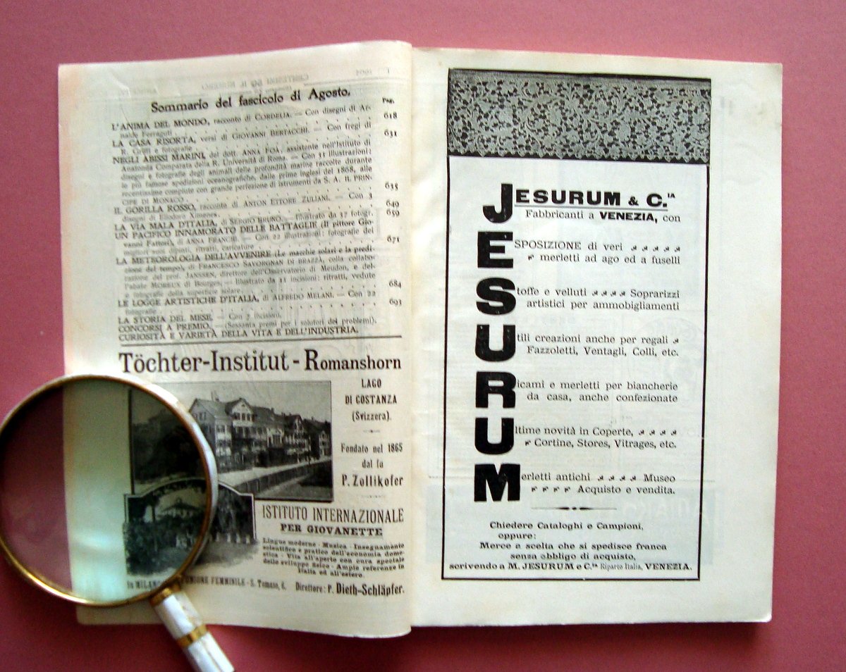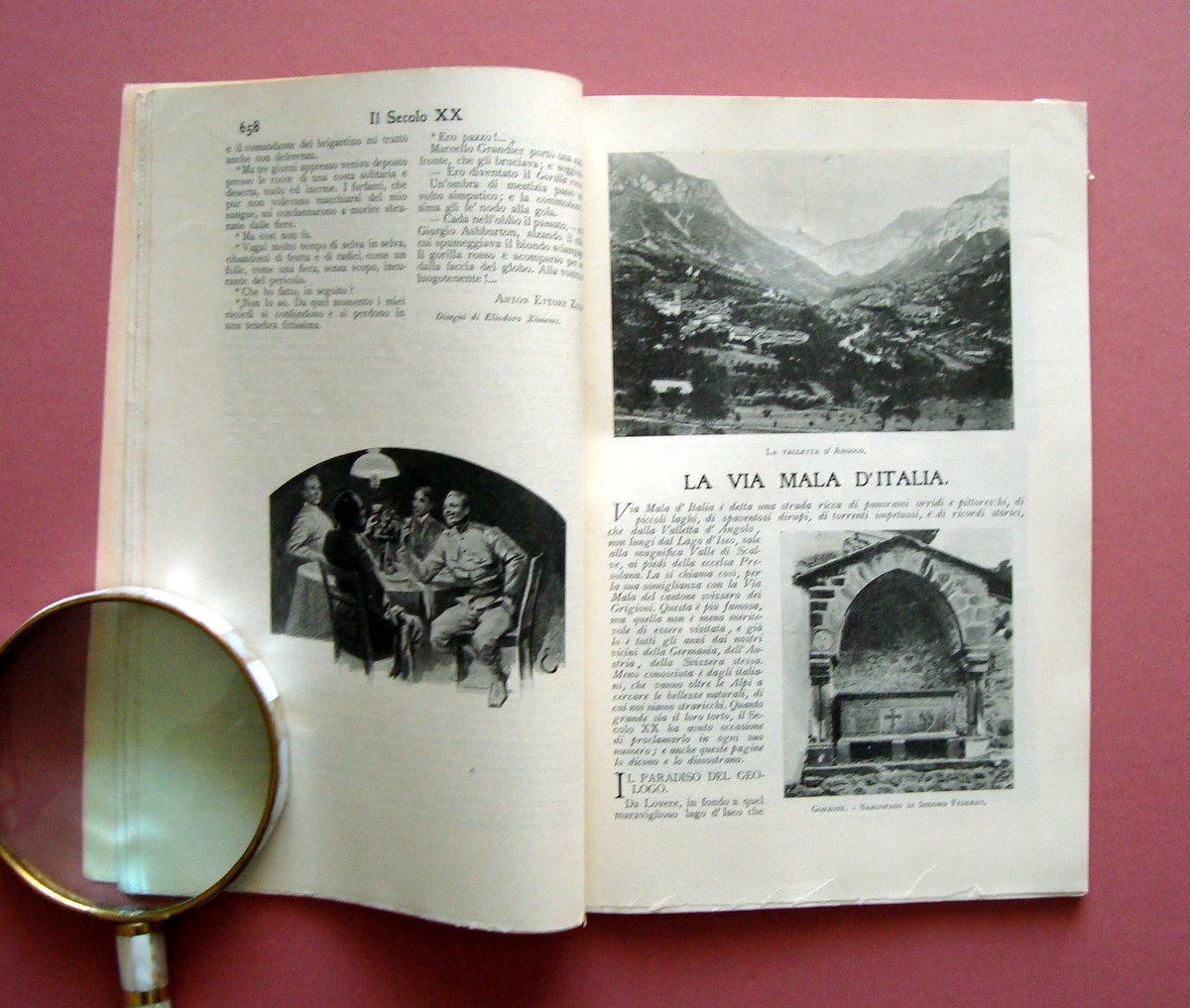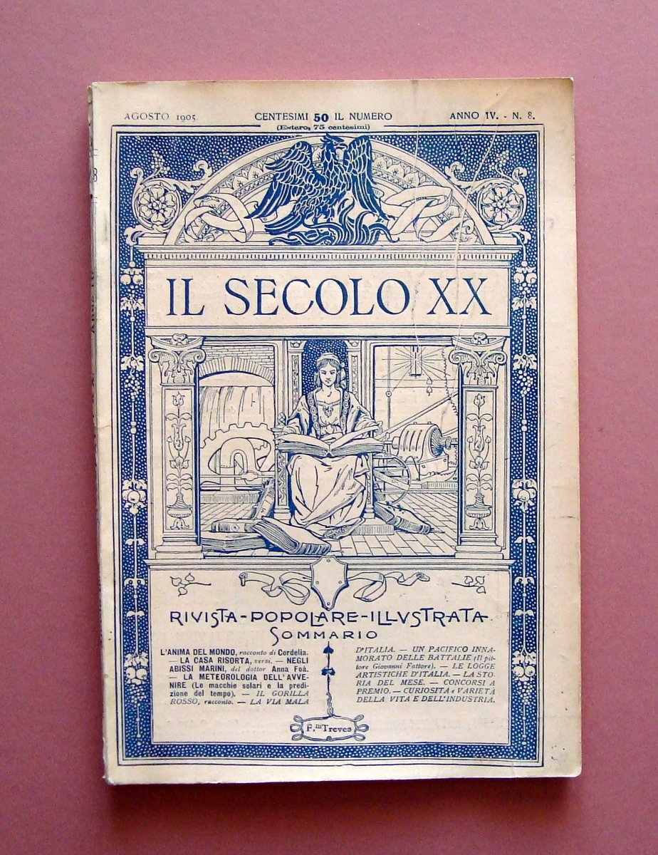 Mensile, Il secolo XX" Rivista Popolare Illustrata Anno IV N. 8 Agosto 1905 "La Via Mala d'Italia" S.A.Fratelli Treves Ed, Milano, 1905, cm. 25x17, pag. da 619 a pag 704+11 (La storia del mese), numerose ill. in b/n nel. t. e fuori. t., alcune inserzioni pubblicitarie d'epoca in b/n in apertura di testo; brossura ed. Copertina ill. Titolo al dorso. Numero completo e compatto. Condizioni di conservazione Esemplare in buone condizioni con tracce d'uso e del tempo; piccolissimi difetti al dorso; interni buoni. "La via Mala d'Italia" di Sergio Bruno pp 12 di testo con 37 illustrazioni fotografiche e in bianco e nero Numero completo. RVS001N00644 blu "
