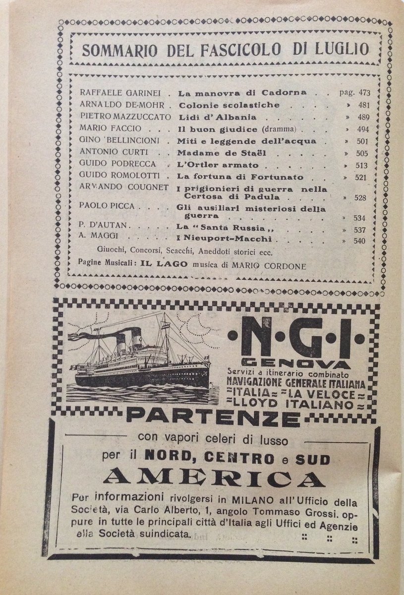 Il Secolo XX n. 7 1∞ Luglio 1917 Cadorna Colonie Scolastiche Nieuport Macchi