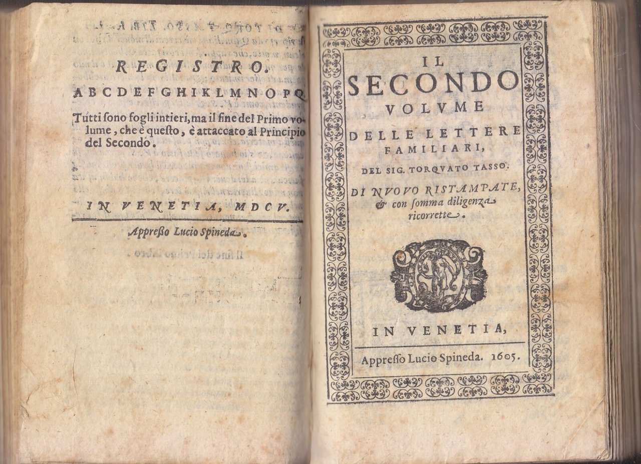 2 VOLUMI RILEGATI IN UNO IL SECRETARIO ET IL PRIMO VOLUME DELLE LETTERE FAMILIARI del sig Torquato Tasso di nuovo ristampate e con somma diligenza ricorrette. e IL SECONDO VOLUME DELLE LETTERE FAMILIARI ecc.