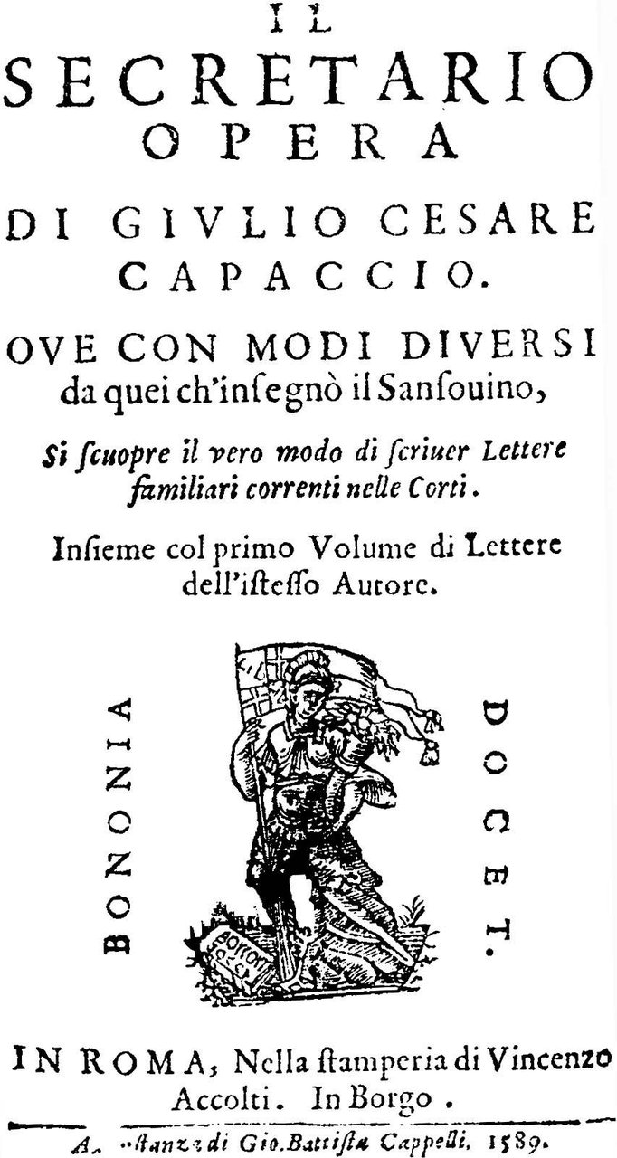 The book is divided into two parts: the first contains the theoretical treatise, the second a choice of model familiar letters by the author himself. “È l'opera di Giulio Cesare Capaccio a inaugurare una lunga stagione di libri per il segretario, che puntano, riprendendo l'invenzione del Sansovino, sull'integrazione fra un discorso normativo (grammaticale e retorico) e l'esemplificazione con ‘lettere familiari' dell'autore stesso. A differenza però dell'opera del Sansovino, in cui i modelli epistolari sono già integrati nella parte teorica, in quella del Capaccio la divisione è più netta: il volume è infatti composto di un libro teorico, sul ruolo e sulla dignità del segretario, e di un secondo libro di esempi, costituiti dalle ‘lettere familiari dell'istesso autore'. Anche qui il Capaccio si discosta dal Sansovino: non inserisce infatti epistole di altri, ma soltanto le proprie. Che voglia differenziarsi dal suo predecessore è chiaro sin dal frontespizio […] Agli occhi del Capaccio, il fortunato libretto del suo predecessore offre modelli ormai distanti dall' ‘ordine comune‘, forse perché ancorato al ruolo di un segretario che non corrisponde più alla realtà. Lo scopo dell'autore è in primo luogo quello di insegnare un sapere tecnico che chiunque abbia buone basi culturali può apprendere […] Nell'opera del segretario napoletano si evidenzia chiaramente ‘la definizione del ruolo dell'intellettuale come cortigiano, cioè come passivo – ma cosciente – strumento d'esecuzione d'una volontà altrove delineata; un ruolo nettamente subalterno o che non a caso si ritaglia come esclusivo ambito di competenza lo specifico della locuzione' [A. Quondam, La parola nel labirinto. Società e scrittura del Manierismo a Napoli, Roma & Bari, 1975, p. 187] […] Quali autori può imitare il segretario? Tra gli antichi Capaccio ne individua uno solo: Cicerone […] Tra i moderni fa i nomi del Bembo, Tolomei, Bonfadio, Tasso, Doni […] Il volume del Capaccio conosce un grande successo: tra il 1589 e il 1607 ha ben 8 edizioni, distribuite fra Napoli e Venezia. Tra l'una e l'altra vi sono numerosi cambiamenti, in modo particolare si assiste all'ampliamento della parte teorica, mentre la parte delle lettere familiari resta uguale alla prima edizione. Anche il frontespizio cambia: scompare il riferimento polemico al Sansovino e il titolo, nell'edizione veneziana di Nicolò Moretti è ben più ampio di quello della princeps. Pe