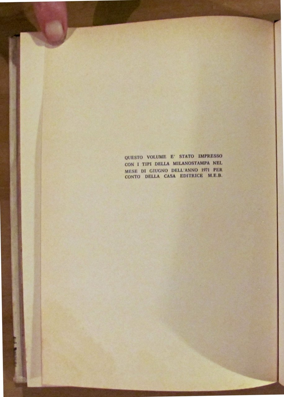 Ed. MEB - Torino, I edizione 1971. Cartonato editoriale in similpelle con sovraccoperta originale. Piccoli taglietti al margine superiore della retrocopertina. Peraltro interno in Stato di Nuovo. 16x22; pp.308. Ottimo stato.