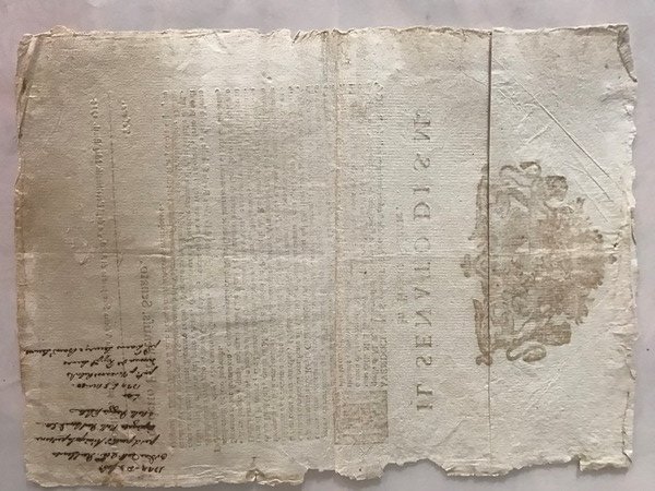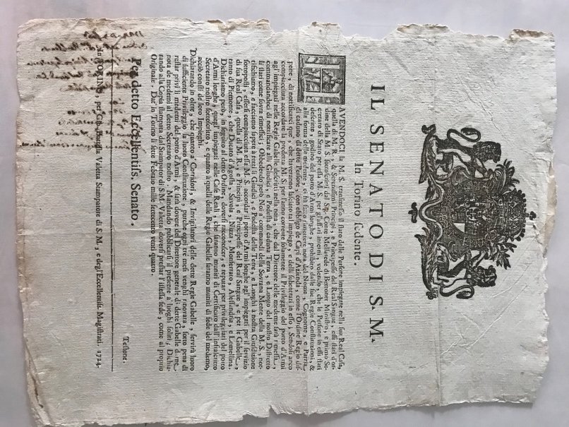 Foglio di 30 x 40 cm. con grande stemma inciso, riportante il permesso di Porto d'Armi accordato dal Senato agli impiegati delle Casa Reale e a quelli delle Regie Gabelle del Piemonte, Ducato d'Aosta, Savoia, Nizza, Monferrato, Alessandria e Lomellina, precisandone i privilegi, obblighi e durata. Scritta a pennino sul verso del foglio, traspare sul bordo inferiore, ma non influisce sul testo. In buono stato.