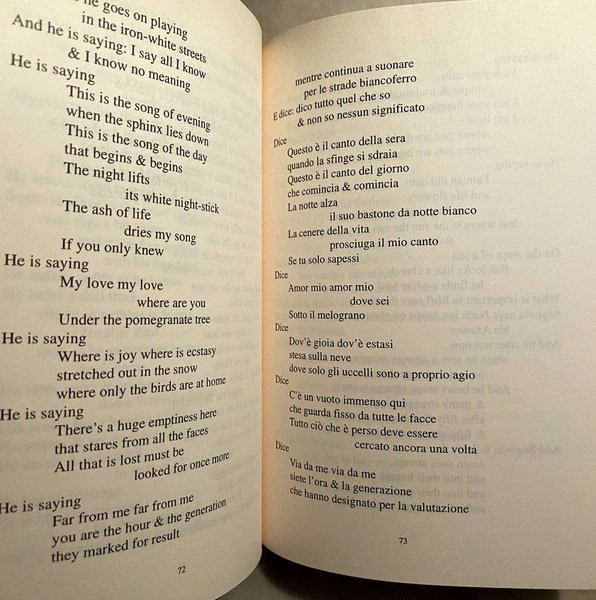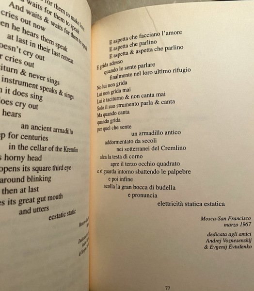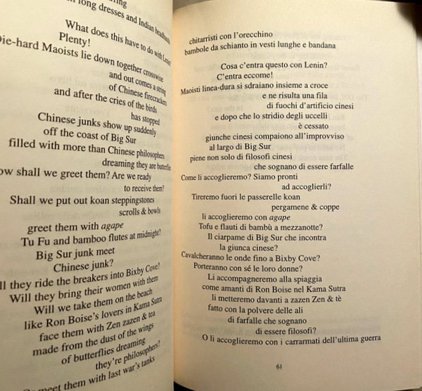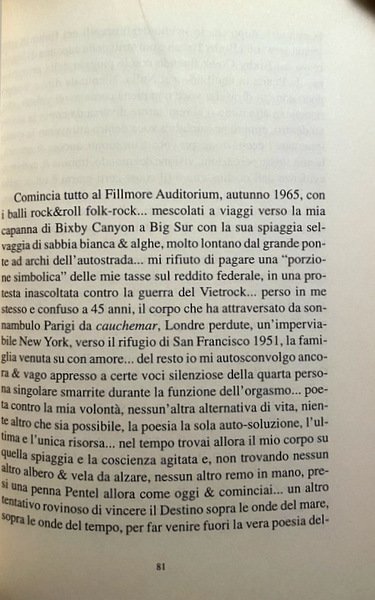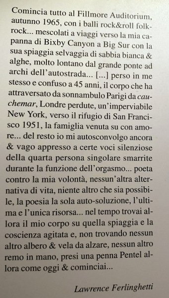 Soggetti: Poesia, Letteratura americana contemporanea, Raccolte poetiche, Antologie, Poesie in lingua inglese, Testo originale a fronte, Meditazioni, Riflessione, Beat generation, Amore, Musica, Arte, Romanzi, Libri Vintage Fuori catalogo, Introvabili, Collezionismo, Da collezione, Rarità, Bestsellers, Intellettuali, Howl and other poems, Allen Ginsberg, A Coney Island of the Mind, Gregory Corso, Jack Kerouac, William Burroughs, Diane DiPrima, Peter Orlowsky, Bukowski, Diario di un vecchio sporcaccione, Minimum fax, Strade sterrate per posti sperduti, Il senso segreto delle cose, Poesie vecchie e nuove, City Lights, Pacifismo, America letteraria, Controcultura, Urlo, Oscenità, Little Boy, Kenneth Rexroth, San Francisco, California, Fernanda Pivano, Battaglie politiche, Rivoluzione, Fluxare, Poeti americani, Novecento, Luna-park dell'anima, Visioni, Viaggio, Psichedeliche, Libertarismo, Anarchismo, New Directions, Golden Gate Park, Big Sur, Spiritualità, Buddhismo, Gary Snyder, Natura, Ecologia, Anarchici, Librai, Everything changes, Tutto cambia, Brooklyn, Orwell, New Yorker, Pablo Neruda, Apollinaire, Poetry, Contemporary American Literature, Poetry Collections, Anthologies, Poems in English, Original Text, Meditations, Reflection, Love, Music, Novels, Out of Print Books, Unavailable, Collectibles, Rarities, Intellectuals, Old Man's Diary dirty, Dirt roads to remote places, The secret sense of Things, Old and new poems, Pacifism, Literary America, Counterculture, Scream, Obscenity, Political battles, Revolution, American poets, Twentieth century, Amusement park of the soul, Visions, Travel, Psychedelics, Libertarianism, Anarchism, Spirituality, Buddhism, Nature, Ecology, Anarchists, Booksellers, After the Cries of the Birds, Moscow in the Wilderness, Assassination Raga, All Too Clearly, Bickfords Buddha, Fillmore Auditorium, Bixby Canyon, Folkrock, Rock & Roll, Pentel, Dallas, Segovia, Mosca