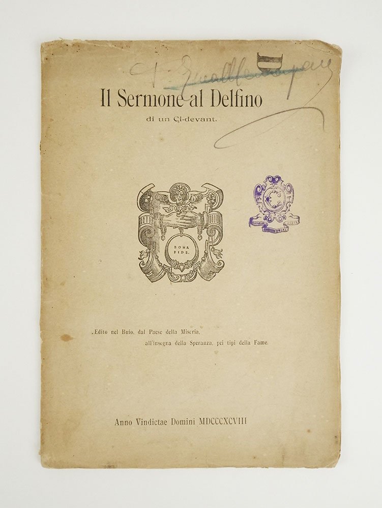 LIBRO Prima edizione. Ottimo esemplare a grandi margini nella variante in brossura avorio, stampato su cara pesante (usura perimetrale alla brossura; restauro al dorso; segni d’attenzione a matita viola nel testo). Timbro di possesso «Biblioteca la Ricciardetta» al piatto anteriore e al frontespizio e firma di possesso al piatto anteriore. Rarissimo opuscolo stampato in cinquanta copie, che reca le fittizie indicazioni editoriali «All’Insegna della Speranza, pei Tipi della Fame». Torna qui preponderante la vicinanza di Lucini agli ultimi, che sembrava essere culminata in «Gian Pietro da Core» con i suoi ideali di ribellione e progresso, ma che in seguito erano parsi affievoliti; riemerge qui invece come reazione sdegnata alla violenza contro i rivoltosi dei moti di Milano (maggio 1898), inserendosi nella poesia di Lucini di quegli anni, che, «risalendo ai grandi modelli di G. Parini e C. Porta, poteva agevolmente essere ricondotta all'interno di una oramai ben definita "linea lombarda", nutrita di concretezza tematica e di partecipazione etico-civile. Lo scopo era quello di cogliere le contraddizioni che si annidavano nella falsa coscienza della società, demistificandone le ipocrisie e i pregiudizi. [.] Prendendo spunto dai moti milanesi del 1898, repressi nel sangue da F. Bava Beccaris, [il «Sermone»] sviluppava un violento discorso antimonarchico» (Giuseppe Zaccaria, «Lucini», voce del «Dizionario biografico degli Italiani», volume 66, 2006). L’opera è significativamente dedicata ad Anna Kuliscioff, che era stata arrestata per sovversione nello stesso 1898. Degni di nota anche i fregi «Bona fide» e «Sine fraude», al piatto anteriore e al frontespizio il primo e al piatto posteriore il secondo: vennero usati altrove da Lucini (ad esempio in «Ai mani gloriosi di Giosuè Carducci», 1907), sempre per libri usciti dalla tipografia Botta di Varazze; la coincidenza spinge a identificare lo stampatore ligure con l’editore di questa rarissima placchetta.
