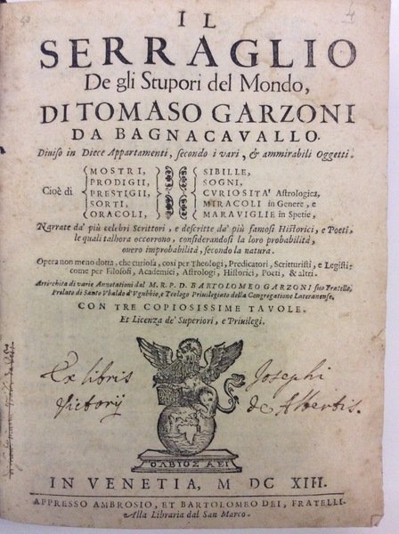 IL SERRAGLIO DE GLI STUPORI DEL MONDO. - Opera... arricchita di varie annotazioni dal M.R.P.D. Bartolomeo Garzoni suo fratello, prelato di Santo Ubaldo d' Ugubbio e teologo privilegiato della Congregazione Lateranense.