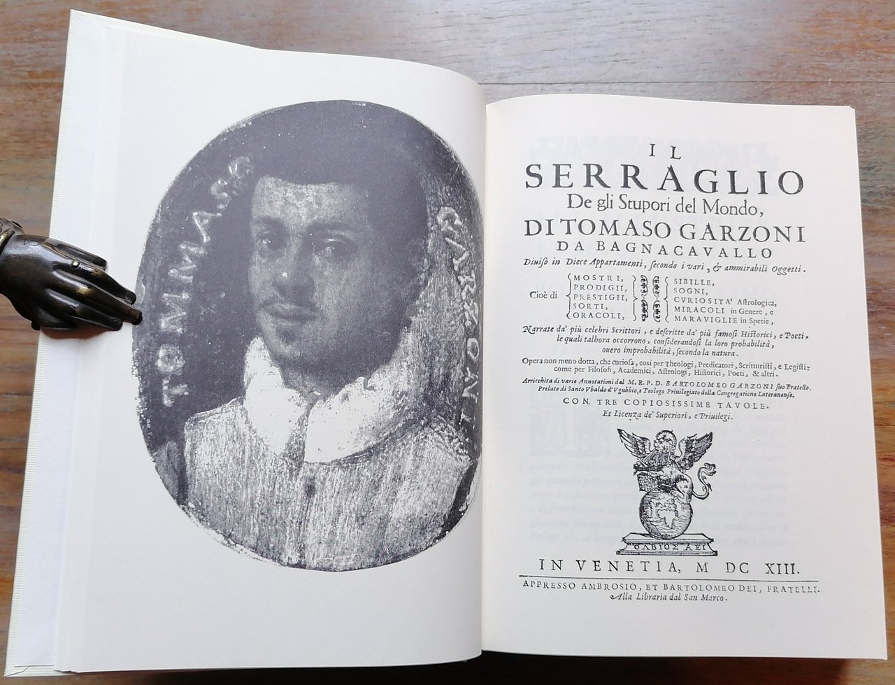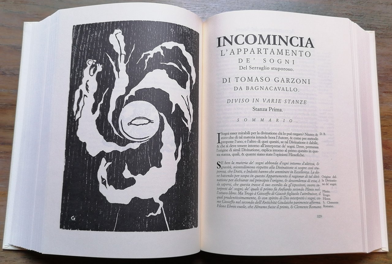 Ristampa dell'edizione di Venezia, Bartolomeo Dei, 1613. In 8°, legatura editoriale in cartone rigido con illustrazioni ai piatti, pp. XLIX,(3),60,(2),787,(5), con un ritratto di Tommaso Garzoni e 10 xilografie nel testo riprodotte nelle dimensioni originali realizzate da Umberto Giovannini nel 2004 presso la FUCINA VACA, per adornare questa riedizione del "Serraglio", doppio segnalibro in tessuto, custodia in cartoncino muto. Introduzione di Paolo Cherchi. Ottimo stato di conservazione, come nuovo.