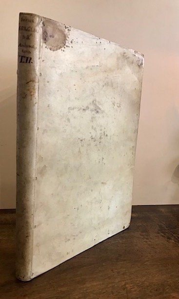 4to (cm. 37), 6 cc.nn., 243(1) pp. Con 120 illustrazioni xilografiche a piena pagina. Marca tipografica al frontespizio, ripetuta in formato più grande al colophon (in cornice figurata: granchio, farfalla e uccelli, mappamondo con due caproni, due cornucopie). Capilettera e fregi n.t. Testo su due colonne in italiano e latino. Legatura antica in pergamena rigida con titolo ms. al ds. (macchia circoscritta al margine superiore del piatto anteriore). Tagli azzurri. Restauro al centro delle prime tre carte che lede in piccola parte lo specchio di stampa, pagine uniformemente ingiallite ed alcune carte un po’ brunite. Nel complesso esemplare genuino e in ottimo stato di conservazione. Provenienza: collezione Moretti, Roma (timbretto ex libris al frontespizio). Rara edizione originale postuma curata da Jacopo Strada, il cui nome figura nella prefazione. In questo settimo ed ultimo Libro del suo celebre trattato di architettura teorica il Serlio si occupa di architettura domestica, con progetti per ville e palazzi, camini, porte, finestre, ecc. Fowler, 326; Riccardi I, 441; Adams, S-978. Non in Cicognara.