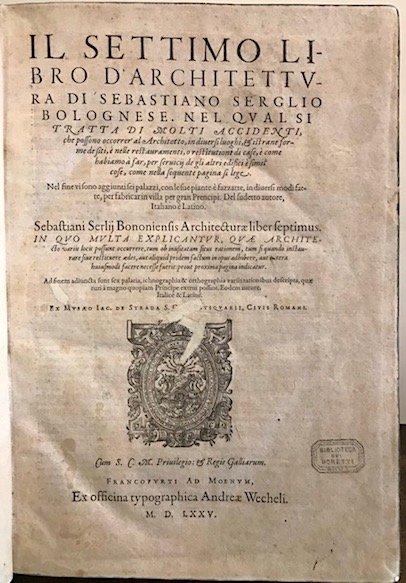 Il settimo Libro d’Architettura di Sebastiano Serglio bolognese. Nel qual si tratta di molti accidenti, che possono occorrer’ al Architetto, in diversi luoghi, & istrane forme de siti, e nelle restauramenti, o restitutioni di case, e come habiamo a far, per servicij de gli altri edifici e simil cose, come nella sequente pagina si lege. Nel fine vi sono aggiunti sei palazzi, con le sue piante e fazzatte, in diversi modi fatte, per fabricar in villa per gran Prencipi. Del sudetto autore, Italiano e latino.