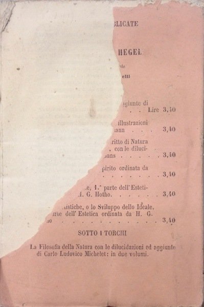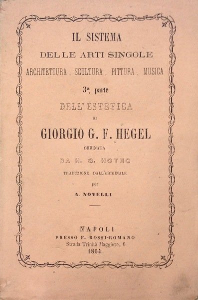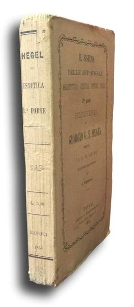 Brossura originale, Prima edizione italiana, Terza parte dell'opera sull'Estetica, dedicata all'Architettura, Scultura, Pittura e Musica. Traduzione di A.Novelli dell'edizione tedesca curata da H.G.Hotho (1832), lievi segni d'uso. Rara edizione. Parte mancante sul retro della copertina.