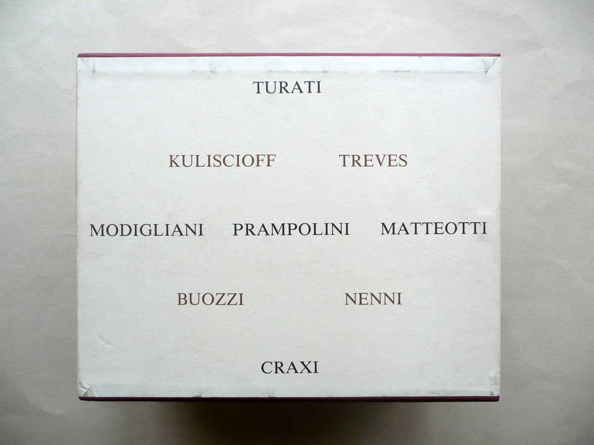 Orazio Pugliese (a cura di), Il Riformismo Socialista Italiano A cura di Orazio Pugliese I. Filippo Turati, Le vie maestre del Socialismo" II. Anna Kuliscioff, "La questione femminile e altri scritti" III. Claudio Treves, "Polemica socialista" IV. Giuseppe E. Modigliani, "La fine della lotta per la vita tra gli uomini" - Camillo Prampolini, "Come avverrà il socialismo e altri scritti" V. Giacomo Matteotti, "Scritti e discorsi" - Bruno Buozzi, "Scritti e discorsi" VI. Pietro Nenni, "Vento del nord" VII. Bettino Craxi, "Il rinnovamento socialista" Marsilio, 1981, cm 24,5x17, pp. XLVIII; 316 (vol. I); pp. XXIV; 180 (vol. II); XXIV; XII; 378 (vol. III); pp. XXXII; 328 (vol. IV); pp. XXXII; 384 (vol. V); pp. XXIV; 408 (vol. VI); pp. VIII; 264 (vol. VII), tutti con qualche ill. in b/n nel t. e fuori t.; tutta tela ed. con titolo in oro al dorso. Opera completa in sette volumi contenuti entro cofanetto ed. in cartonato telato, ill. in b/n ai margini. Condizioni di conservazione Volumi tutti ben conservati con leggere tracce d'uso; dorsi leggermente ingialliti (vedi foto). Interni pressoché ottimi. Cofanetto ed. ben conservato con alcuni minimi difetti e qualche pressoché trascurabile traccia di sporco. Opera completa in sette volumi. SETT114.L10927 N "