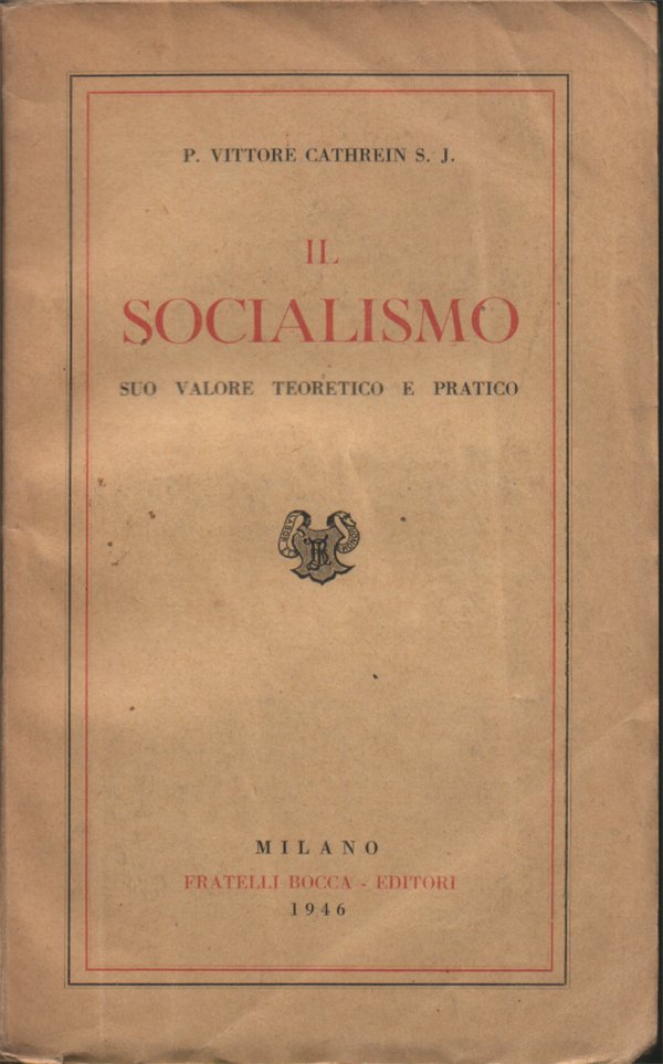 In-8°, pp. 192, (2), copertina editoriale. L'autore, Vittore Cathtein, era un gesuita. N. 2 nella collana "Piccola Biblioteca di Scienze Moderne". Indice: Prefazione del Traduttore; Capo I. Concetto e storia del socialismo. Art. 1. Concetto del socialismo - Sua relazione col comunismo; Art. 2. Notizie storiche relative al socialismo; § 1. Il socialismo nell'antichità e nel medio evo; § 2. I precursori del moderno socialismo; § 3. Carlo Marx fondatore principale del socialismo moderno. A. Notizie storiche. B. I principii scientifici del sistema del Marx: I. La considerazione materialistica della storia; II. La produzione capitalistica e la teoria del profitto (Mehrwerth); § 4. La forza presente del socialismo. A. Programma di Gotha (1875); B. Programma di Erfurt (1891). Capo II. Insussistenza dei principi del socialismo. Art. 1. I principi filosofici e religiosi: § 1. La considerazione materialistica della storia; § 2. Universale uguaglianza di tutti gli uomini; § 3. Eccessivo apprezzamento della vita economica; § Ostilità del socialismo contro la religione. Art. 2. I principii dell'economia politica: § 1. La teoria socialista del valore; § 2. La legge del salario; § 3. La riserva dell'esercito industriale. Art. 3. Radici e fonti del socialismo - Sua relazione col liberalismo. Capo III. Impossibilità pratica del socialismo. Art. 1. Determinazione precisa della quistione; Art. 2. L'organizzazione della produzione; § 1. Specializzazione della proprietà produttiva; § 2. Determinazione della quantità necessaria; § 3. Distribuzione delle forze del lavoro; § 4. Distribuzione del lavoro: scelta della professione; § 5. Alcuni assurdi ripieghi; § 6. Risposta ad un'obbiezione; § 7. Impossibilità dell'organizzazione di tutti i lavori per parte dello stato. Art. 3. Proventi e progressi del socialismo. § 1. Sogni socialistici; § 2. L'operosità ed economia nel socialismo; § 3. Il progresso nello stato dei socialisti; § 4. Arte e scienza nel socialismo. Art. 4. La spartizione dei prodotti del lavoro. § 1. Il tempo del lavoro; § 2. L'opera eseguita; § 3. La diligenza; § 4. Il bisogno. Art. 5. La famiglia nel socialismo. § 1. Il matrimonio; § 2. Educazione ed istruzione. Art. 6. Risposta ad alcune obbiezioni: § 1. Il comunismo degli ordini religiosi; § 2. Le grandi fabbriche industriali moderne; § 3. La moderna milizia; § 4. Le società d'azionisti. Conclusione.