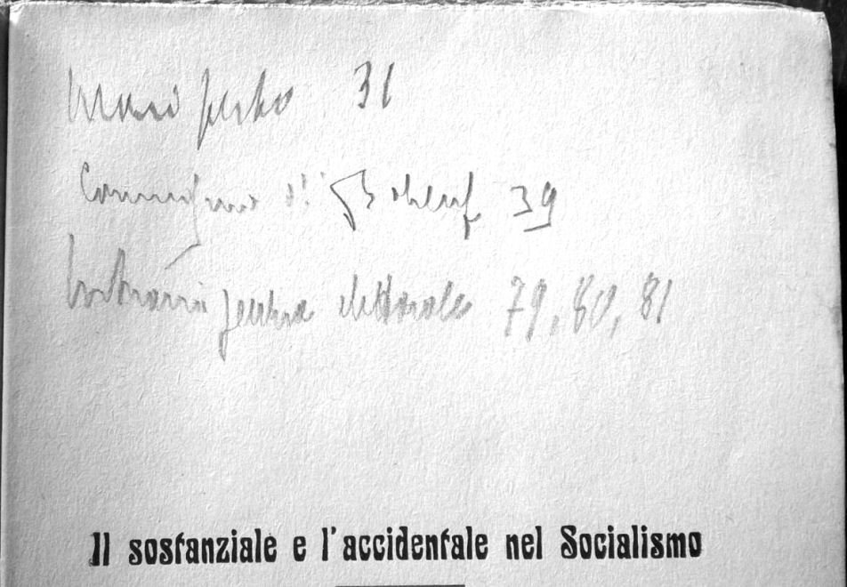 In 16, p. 84 [12], br. orig. con difetti al dorso. Il libro ha numerose ed interessanti note autografe, a matita, di Benito Mussolini scritte presumibilmente intorno al 1917. Il volume proviene dalla biblioteca di Mario Gioda, amico di Mussolini e , corrispondente del Popolo d'Italia da Torino. I due ebbero numerosi rapporti personali e politici, entrambi aderenti all'interventismo da posizioni socialiste, durante gli anni che vanno dall'entrata in guerra al 1924.