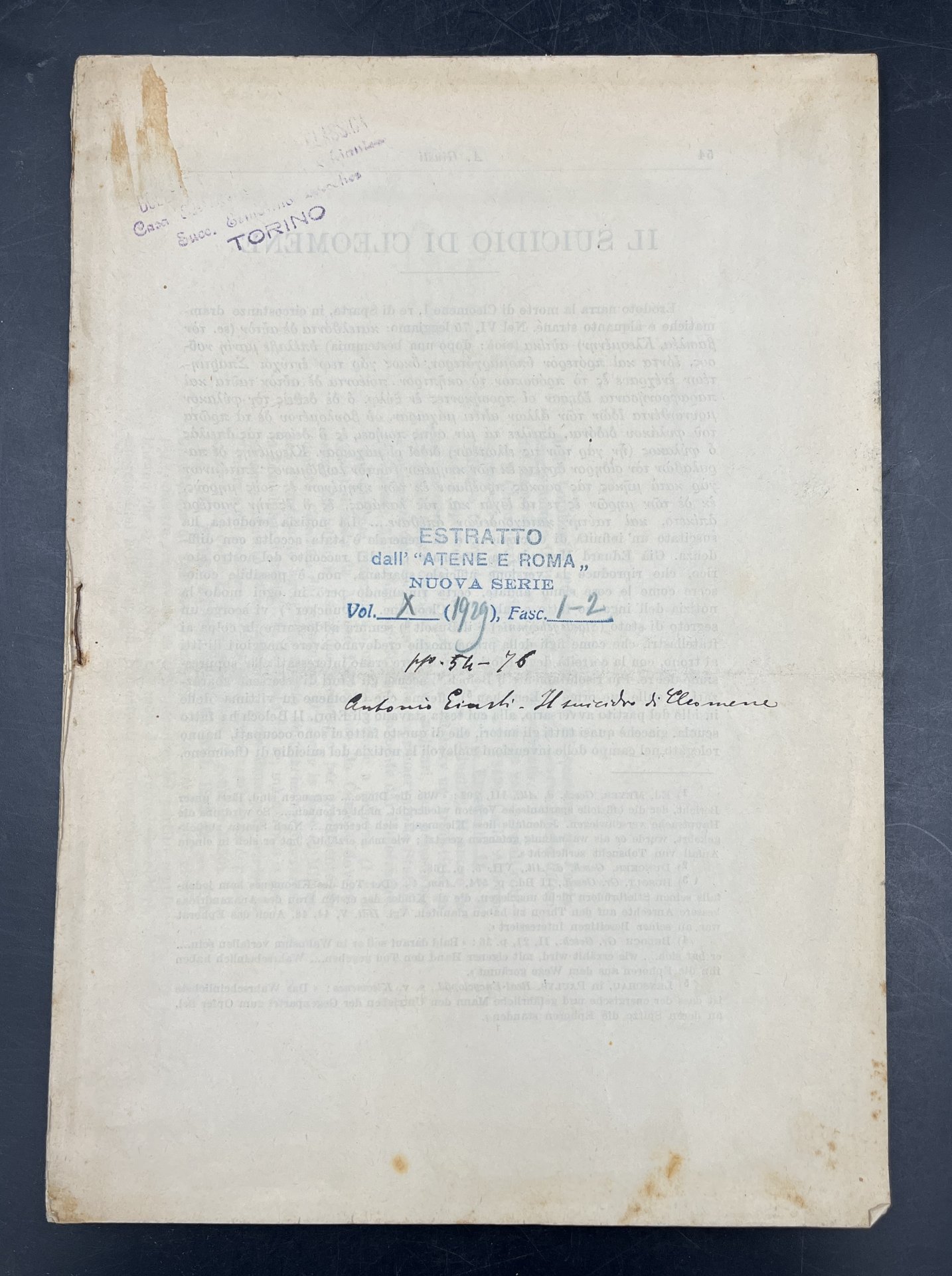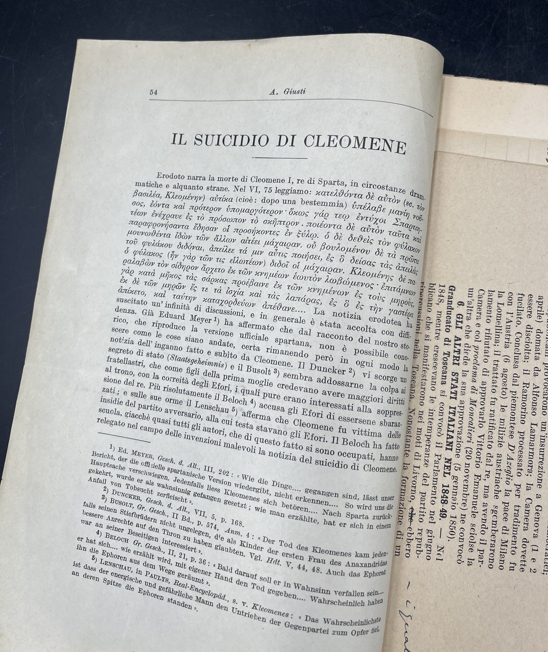 IL SUICIDIO di CLEOMENE [re di Sparte dal 521 al 488 a. C.]. Stralcio da Atene e Roma, n. s. vol. X, 1929, fasc. 1-2. Con note manOscritte del prof. Giuseppe CORRADI.