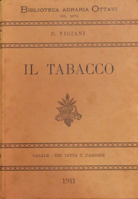 Biblioteca Agraria Ottavi, volume XCVII, Stabilimento Tipografico Ditta C. Cassone, 1911 (prima edizione). In 12esimo, pp. XI (di Indici), 167 + 3 con l'elenco della “Biblioteca Agraria Ottavi”, ill. in b/n n. t., bross. edit. in carta marrone con titoli in nero. Tutto ciò che di si deve sapere su questa speciale coltivazione del tabacco. Prima rara edizione. Buona conservazione.