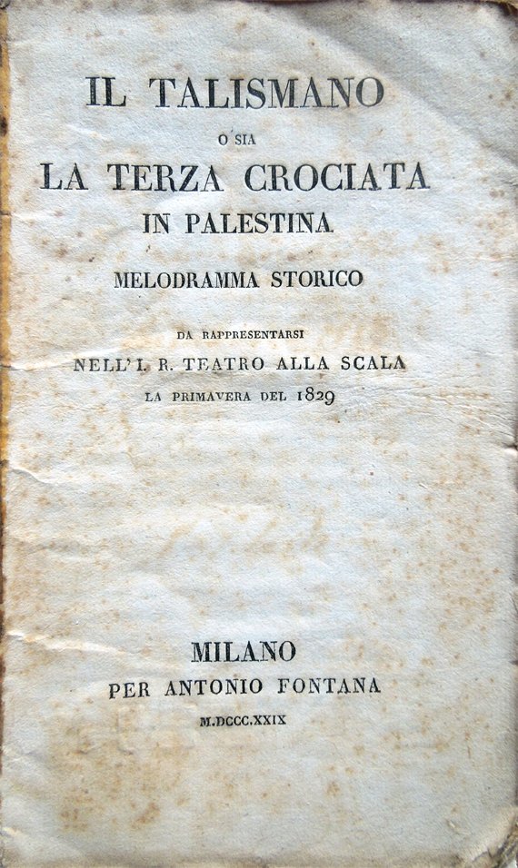 In-16° (18 x 10,8 cm), pp. 52, copertina editoriale con titoli entro cornice decorata. Segni d'uso e del tempo alla copertina, cui è stato rifatto il dorso. Alla copertina anteriore, firma d'appartenenza, data ed integrazione al titolo scritte da mano coeva: l'inchiostro, ossidato, nella parte centrale della copertina, ha provocato delle piccolissime perdite di carta, reintegrate con carta giapponese, perdite che rendono parzialmente illeggibile la nota dell'editore alla seconda di copertina. Vignetta al frontespizio. Qualche segno d'umido alle pagine, per il resto ben conservato. Musica del Maestro Giovanni Pacini. Scenografia di Alessandro Sanquirico. L'azione si svolge in Palestina nel campo dei Crociati, intorno al 1190. Dal proemio dell'autore: "Il notissimo Talismano di Walter Scott è la traccia su cui questo melodramma fu scritto. Esso è storico all'incirca come il suo primo modello, cioè in relazione ai caratteri de' principali personaggi, salvi quegli evidenti indispensabili cambiamenti che le leggi della nostra scena drammatica comandavano . Nella tessitura del mio componimento non mi sono prefisso che uno scopo: servire i concetti che suggeriva a mano a mano al compositor della musica ogni situazione del Romanzo più a lui prediletta. Ho pensato che sia questo il sistema, non il più cattivo almeno, da seguire per chi si assume il lavoro di pazienza di scrivere libretti d'opera. Comprendo indubitamente che, col gusto musicale dominante, schifo anziché no della copia de' recitativi, e ardentissimo di situazioni sempre cambiate, il mio metodo non sarà il più utile alla regolarità progressiva dello sviluppo drammatico; ma si chiede un libretto per opera in musica, non una tragedia o commedia da essere recitata, e sempreché l'autore possa conservare una certa chiarezza di condotta, e non dar bando ai primi precetti del ritmo e della pura lingua poetica, è già qualche cosa se lo stesso libretto, non abbisognando delle così dette virgolature per parte di chi scrive la musica, presenta al leggitore né più né meno di quanto egli dee vedere ed udire dalla scena". Personaggi ed interpreti: Riccardo Cuor di Leone, Antonio Tamburini; Berengaria, moglie di Riccardo, Marietta Tamburini Gioja; Edita, soprannominata l'Angioina, principessa del sangue reale d'Inghilterra, cugina di Riccardo, Emilia Bonini; Il cavaliere del Leopardo, Giovan Battista Rubini; Lord Multon, antico favorito e fedele compagno d'armi del re Riccardo, Giuseppe Frezzolini; Un medico saracino, Luigi Biondini; Il Gran Maestro de' Templari, Lorenzo Biondi; Enrico, paggio della regina Berengaria, Marietta Biondi; Un capo di Marabuti, Lorenzo Lombardi; Principi, Crociati e Templari; Grandi, Uffiziali e Soldati del re d'Inghilterra; Dame della regina d'Inghilterra, Donne inglesi e trovadori; Guerrieri di Saladino e vivandiere del campo; Soldati Saracini; Marabuti; Banda araba. Ballerini. Inventore e Compositore de' Balli: Giovanni Galzerani. Primi Ballerini serj: Paolo Samengo, Amalia Samengo Brugnoli, Maria Conti, Angiola Besozzi; Primi Ballerini per le parti: Antonio Ramacini, Pietro Trigambi, Giovanni Goldoni, Elisabetta Stefanini, Giuditta Bencini; Primo ballerino per le parti giocose: Antonio Aleva; Primi Ballerini: Carlo Marchesi, Pietro Bondoni; Primi ballerini di mezzo carattere: Giovanni Baranzoni, Luigi Masini, Giovanni Luzina, Luigia Novellau, Anna Gabba, Caterina Terzani; Ballerini per le parti: Carlo Bianciardi, Antonio Siley, Giacomo Trabattoni; Altri Ballerini: Fioravanti Borresi, Pietro Cipriani, Giuseppe Ponzoni, Antonio Caprotti, Francesco Villa, Fedele Caldi, Giuseppe Fontana, Francesco Bencini, Gaetano Croce, Gaetano Sevesi, Giovanna Viscardi, Eugenia Braschi, Luigia Ardemagni, Carolina Scanagatti. Imperiale Regia Accademia di Ballo. Maestri di Perfezionamento: Carlo Guillet e Anna Giuseppina Guillet; Maestro di Ballo: Carlo Villeneuve; Maestro di Mimica ed aggiunto: Teresa Monticini; Allievi emeriti dell'Imperiale Regia Accademia: Angiola Vaghi, Giuseppa Nolli, Margherita Vignola, Rachele Cazzaniga, Giuseppa Romani, Rosalba Braghiera, Amalia Pizzi, Virginia Turpini, Gio. Battista Grillo, Tommaso Casati, Carlo Della Croce. Altri allievi dell'Imperiale Regia Accademia: Gaetana Carcano, Anna Trabattoni, Carolina Bonalumi, Amalia Braschi, Rosa Opizzi, Carolina Filippini, Angiola Pozzi, Luigia Aureggio, Rosalia Molina, Giuseppa Cafulio, Fel. Oggioni, Carolina Frassi, Luigia Sassi, Carolina Crippa, Elisabetta Monti, Adelaide Gabba, Carlotta Padditi, Adelaide Superti, Francesca Serié, Carolina Conti, Teresa Merli, Carolina Anselman, Vincenza Garrera, Teresa Bellini, Carlo Vago, Aurelio Quattri, Solone Viganoni, Benigno Colombo, Giovanni Gramigna. Musicisti. Maestro al cembalo: Vincenzo Lavigna; Primo Violino, Capo d'Orchestra: Alessandro Rolla; Altro primo Violino, in sostituzione del sig. Rolla: Giovanni Cavinati; Primo Violino de' Secondi: Giacomo Buccinelli; Primo Violino per i Balli: Ferdinando Pontelibero; Altro primo Violino, in sostituzione del sig. Pontelibero: Francesco De Bayllou; Primo Violoncello al Cembalo: Vincenzo Merighi; Altro primo Violoncello in sostituzione del sig. Merighi: Giacomo Gallinotti; Primo Contrabbasso al Cembalo: Giuseppe Andreoli; Altro Primo Contrabbasso in sostituzione del sig. Andreoli: Francesco Hurt; Prima Viola: Carlo Maino; Primi Clarinetti a perfetta vicenda: Pietro Tassistro - Felice Corrado; Primi Oboe a perfetta vicenda: Carlo Ivon - Giuseppe Beccali; Primo Fagotto: Gaudenzio Lavaria; Primo Flauto: Giuseppe Raboni; Primo Corno da Caccia: Agostino Belloli; Prima Tromba: Giuseppe Thomas; Professore d'Arpa: Giuseppe Reichlin. Maestro Direttore dei Cori: Antonio Bruschetti; Editore della Musica: Giovanni Ricordi; Macchinista: Gervaso Pavesi; Attrezzisti: Giuseppe Fornari, Carlo Figini; Direttrice della sartoria: Rosa Cervi; Capi sarti: Antonio Rossetti, Antonio Majoli e Giuseppe Orsini; Berrettonaro: Giosuè Parravicini; Parrucchiere: Innocente Bonacina; C