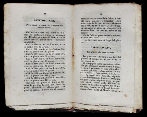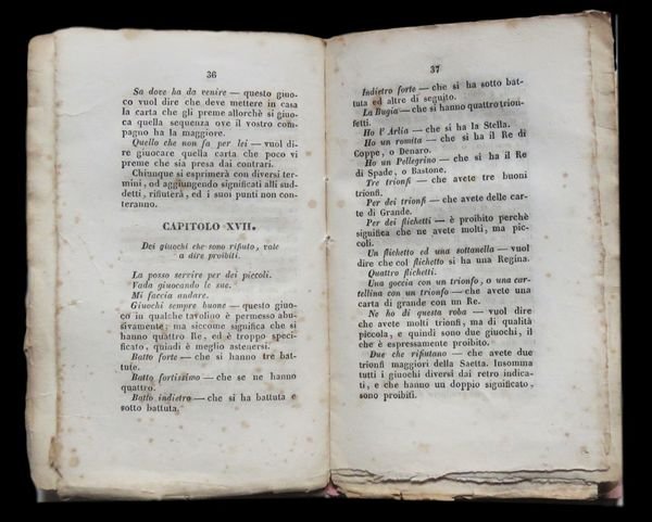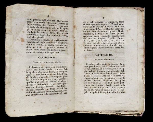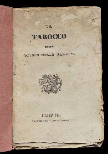 In 12° (15,5x10 cm); 55, (1) pp. Brossura ottocentesca. Qualche piccola mancanza al margine alto bianco del frontespizio con antica integrazione e rinforzo al dorso e per il resto in buone condizioni di conservazione ed ancora in barbe. Prima rarissima edizione, un solo esemplare censito in ICCU, di questa monografia dedicata al gioco del Tarocco secondo le regole bolognesi. Lopera che è una delle principali fonti per il gioco del Tarocco bolognese, ebbe un notevole successo e vide due riedizioni, una nel 1872 e una nel 1919. Il volume raccoglie e codifica le regole del gioco del tarocco bolognese dando particolare risalto al conteggio dei punti che allinizio dellottocento risultava particolarmente complicato ed arbitrario, dando spesso adito a discussioni fra i giocatori. Verardini, nella stesura del testo, si avvalse della consulenza di alcuni dei più noti giocatori bolognesi dellepoca. Opera molto rara. Rif. Bibl.: Lensi, 170.