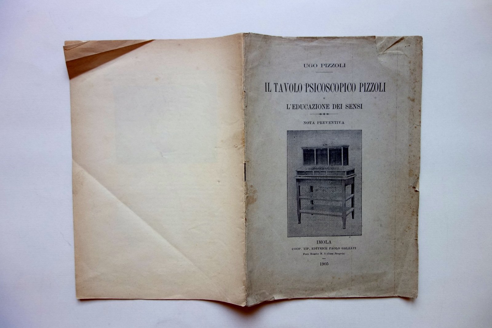 Ugo Pizzoli, Il Tavolo Psicotropico Pizzoli e l'educazione dei sensi - nota preventiva Coop. Tip. Paolo Galeati, Imola 1905; cm 24,5x17; pp. 26 con varie ill. in b/n; brossura ant. ill. a colori, mancanza della brossura post. Condizioni di conservazione Esemplare in condizioni pi√π che discrete con tracce d'uso, mancante della brossura posteriore ma compatto grazie alla spillatura; brossura ant. con qualche marginale strappetto, pieghette e minimo foxing. Interni buoni; tracce di pieghe all'ultima pagina e all'ultima carta bianca. Raro. SC03.D17301 N