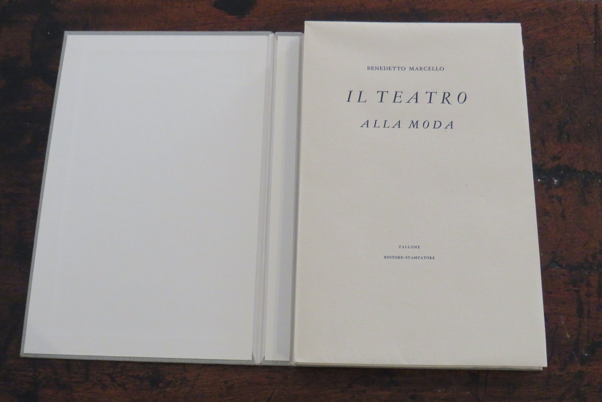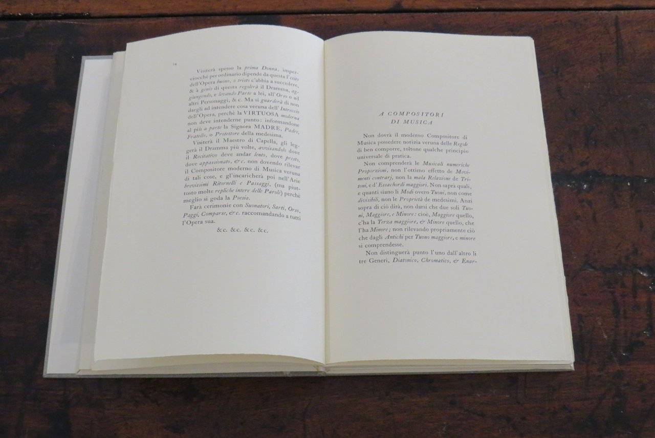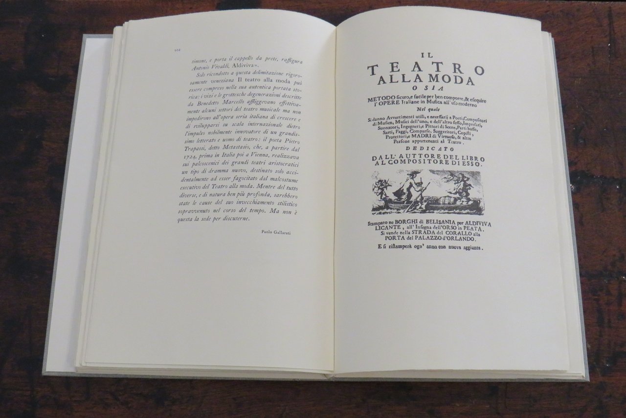 Alpignano, Tallone Editore-Stampatore, 1982. In -8 (mm. 170,2x260), pp. 102, (10), con una tavola in nero fuori testo, che riproduce al recto il frontespizio dell’edizione originale. Brossura editoriale a risvolti, con titoli impressi al piatto anteriore, in camicia di cartone rigido, con titoli impressi al dorso. Questo testo è "il più noto e celebrato pamphlet di tutta la vastissima letteratura sul melodramma settecentesco". Libro satirico, divertente e attuale, del celebre e noto compositore veneziano Marcello Benedetto (a cui è dedicato il Conservatorio di Venezia), che mette in luce i 'difetti' della vita teatrale, gli atteggiamenti delle maestranze e degli impresari che appartenevano a quel mondo. Aspra critica nei confronti del teatro barocco e delle sue scenografie stravaganti, satira del teatro musicale di Antonio Vivaldi ("il teatro era quello di S. Angelo dove Antonio Vivaldi usava rappresentare le sue opere, contro le quali si appuntano gli strali polemici del Marcello"). Alla fine: un testo di Paolo Gallarati ("il testo che qui si riproduce è la trascrizione diplomatica della prima edizione a stampa de Il teatro alla moda pubblicato a Venezia nel 1720 da Benedetto Marcello (Venezia, 1686-Brescia, 1739), musicista e magistrato di nobile famiglia patrizia, ammirato nel mondo musicale contemporaneo per la raccolta di cinquanta salmi per soli, coro e strumenti…") e la Bibliografia. Edizione composta con i tipi "Caslon". Tiratura di 290 esemplari numerati (il nostro esemplare n. 53, della tiratura di 215 copie su "velina Magnani avorio"). Cofanetto cartonato con lieve macchia scura al verso, al margine inferiore destro. Ottimo esemplare.