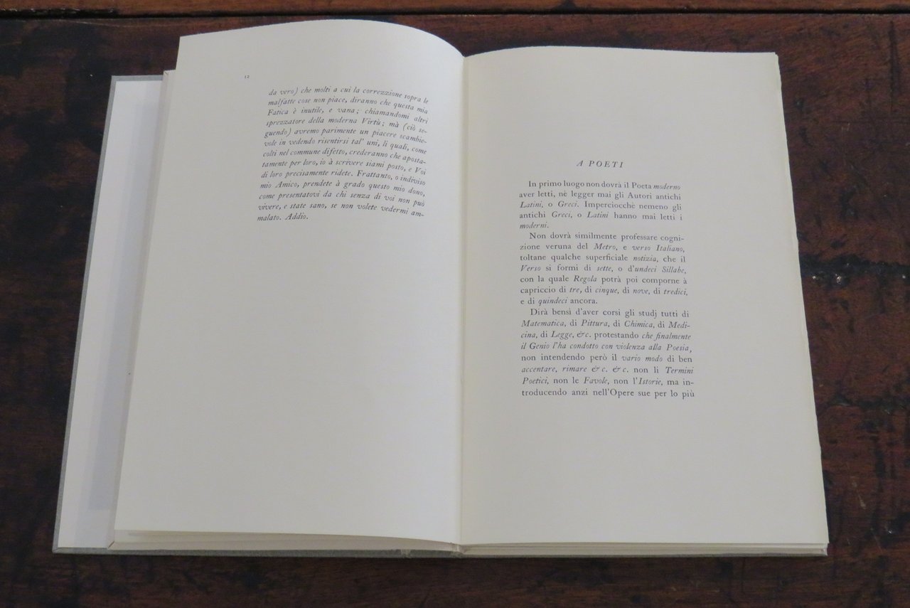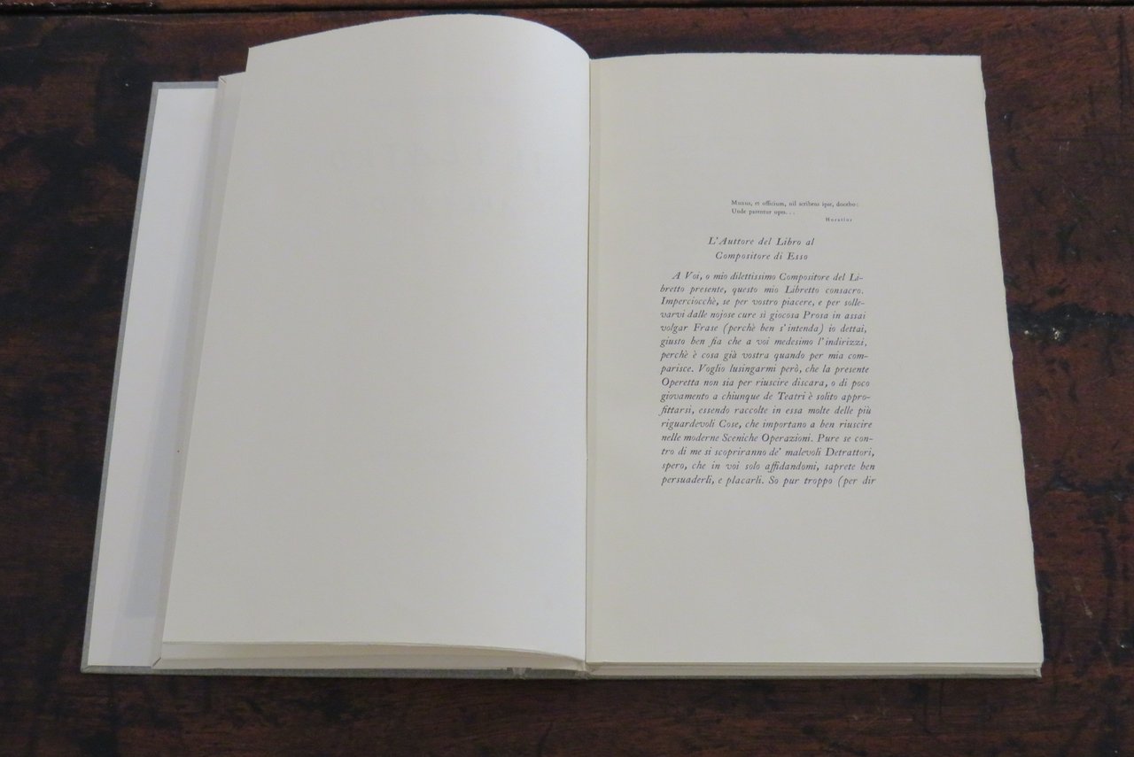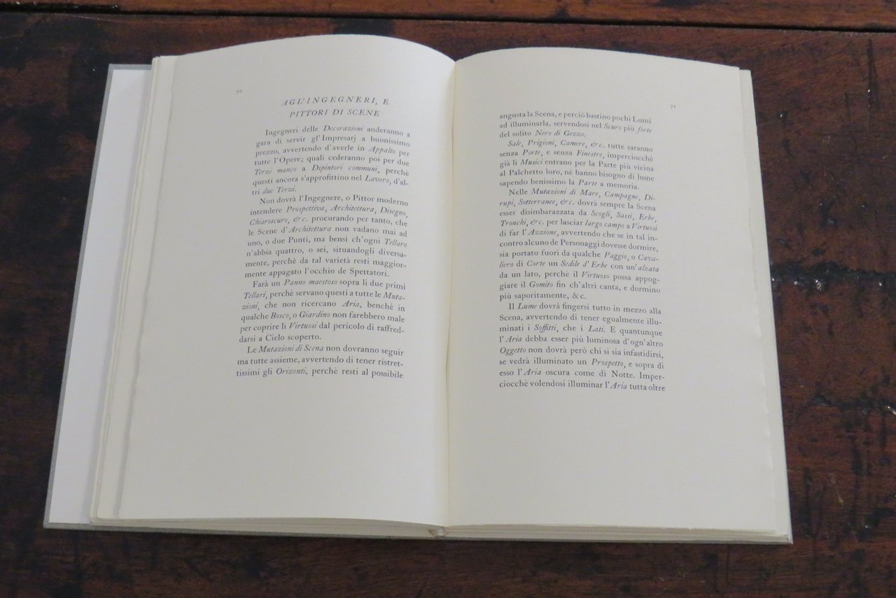 Alpignano, Tallone Editore-Stampatore, 1982. In -8 (mm. 170,2x260), pp. 102, (10), con una tavola in nero fuori testo, che riproduce al recto il frontespizio dell’edizione originale. Brossura editoriale a risvolti, con titoli impressi al piatto anteriore, in camicia di cartone rigido, con titoli impressi al dorso. Questo testo è "il più noto e celebrato pamphlet di tutta la vastissima letteratura sul melodramma settecentesco". Libro satirico, divertente e attuale, del celebre e noto compositore veneziano Marcello Benedetto (a cui è dedicato il Conservatorio di Venezia), che mette in luce i 'difetti' della vita teatrale, gli atteggiamenti delle maestranze e degli impresari che appartenevano a quel mondo. Aspra critica nei confronti del teatro barocco e delle sue scenografie stravaganti, satira del teatro musicale di Antonio Vivaldi ("il teatro era quello di S. Angelo dove Antonio Vivaldi usava rappresentare le sue opere, contro le quali si appuntano gli strali polemici del Marcello"). Alla fine: un testo di Paolo Gallarati ("il testo che qui si riproduce è la trascrizione diplomatica della prima edizione a stampa de Il teatro alla moda pubblicato a Venezia nel 1720 da Benedetto Marcello (Venezia, 1686-Brescia, 1739), musicista e magistrato di nobile famiglia patrizia, ammirato nel mondo musicale contemporaneo per la raccolta di cinquanta salmi per soli, coro e strumenti…") e la Bibliografia. Edizione composta con i tipi "Caslon". Tiratura di 290 esemplari numerati (il nostro esemplare n. 53, della tiratura di 215 copie su "velina Magnani avorio"). Cofanetto cartonato con lieve macchia scura al verso, al margine inferiore destro. Ottimo esemplare.