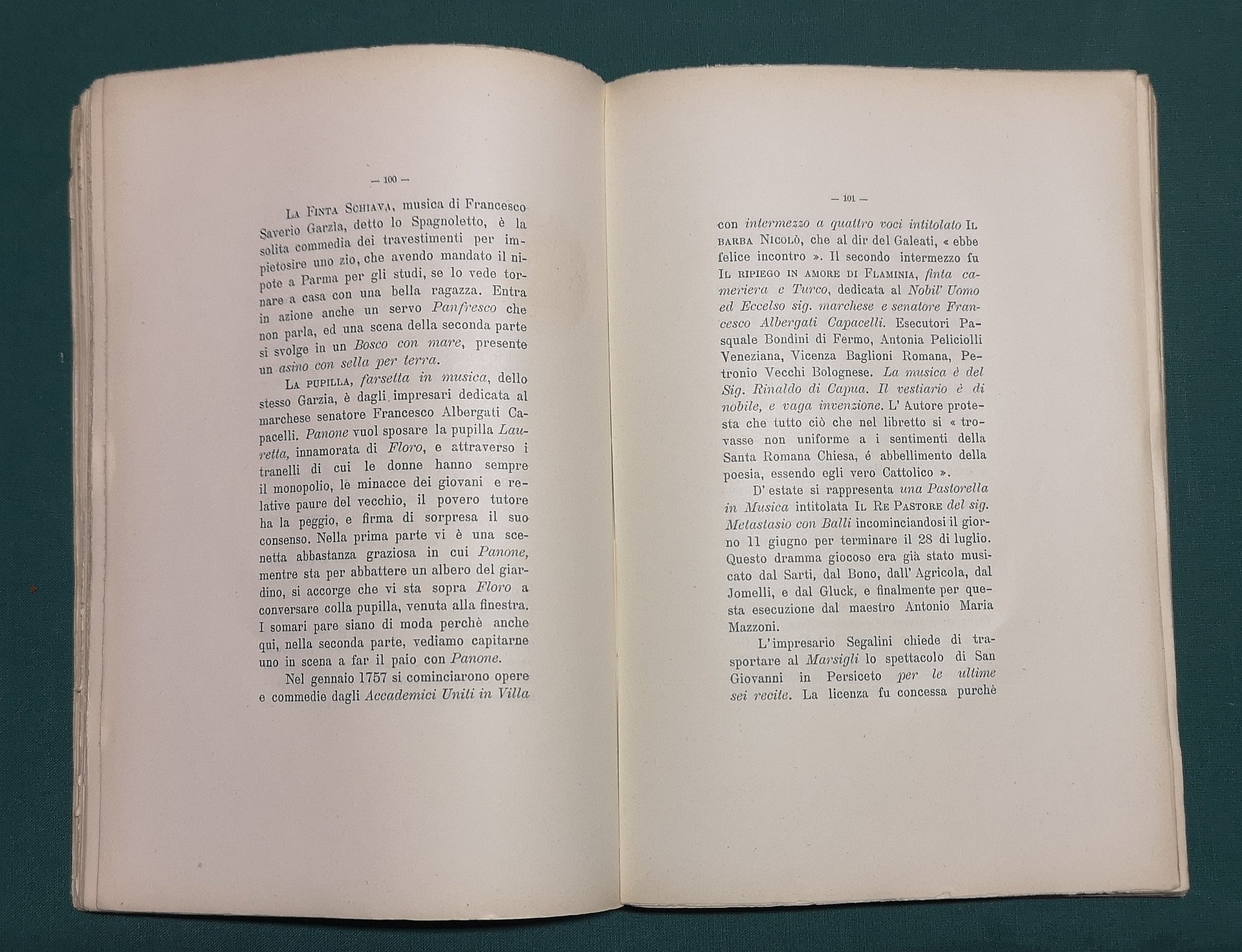 >in-8, pp. pp. 237, (1); broch. edit. (dorso rinforzato). Opera dedicata alla marchesa Anna Marsigli nel dì delle sue nozze col conte Fulco Tosti dei duchi di Valminuta. Interessante monografia dedicata al teatro Marsigli-Rossi, situato in Strada Maggiore nei pressi della chiesa dei Servi, prima di essere demolito nel 1828. Inaugurato nel 1701, con l'opera Partenope di Luca Antonio Predieri (1688-1767), il Marsigli era dedicato soprattutto all'opera buffa, e ospitò solisti del calibro di Niccolò Paganini (1801). Perfetto esemplare, freschissimo e a pieni margini.