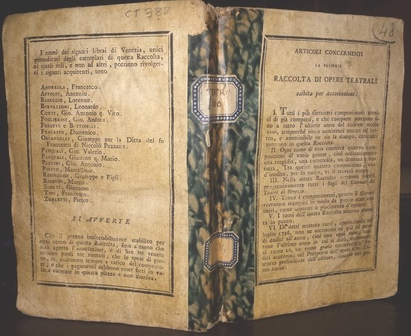 In-16 (18 cm) 8 95 (1) 84 (1) 72. Contiene "Il salto di Leucade tragedia inedita", "L'incostanza punita commedia del signor Greppi", "Emilia dramma di Francesco Albergati Capacelli". Brossura editoriale con dorso rivestito in carta marmorizzata. Fa parte di: "Il teatro moderno applaudito ossia raccolta di tragedie, commedie, drammi e farse … corredata di notizie storico-critiche e del giornale dei teatri di Venezia … " Venezia, 1796-1801. Stampato da Antonio Fortunato Stella. Pindemonte Giovanni (1751-1812). Marchese, poeta e tragediografo, podestà. Tutti i tomi recano la stessa copertina editoriale con le norme per la sottoscrizione dell'opera, i nomi dei librai veneziani che la vendono, il prezzo (3 lire venete o 3 paoli romani). Ogni tomo contiene 4 opere, ognuna seguita dalle notizie storico critiche, e inizia col Giornale dei teatri di Venezia. Ottime condizioni. Raro.