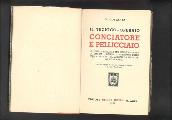 IN 16, pp.XV, 403, COPERTINA EDITORIALE CON TITOLO SU FONDO ARANCIO + SOVRACOPERTINA ILLUSTRATA CON TITOLO. 184 FIGURE DA DISEGNI ORIGINALI, 5 TABELLE E 3 TAVOLE f.t. IL LIBRO, TRATTA DELLA PELLE, PREPARAZIONE DELLE PELLI PER LA CONCIA, CONCIA, RIFINIZIONE DELLE PELLI CONCIATE, GLI ANIMALI DA PELLICCIA, LA PELLICCERIA.<BR>ALCUNE MANCANZE MINIME ALLA SOVRACOPERTINA, ALTRIMENTI OTTIMA CONSERVAZIONE.
